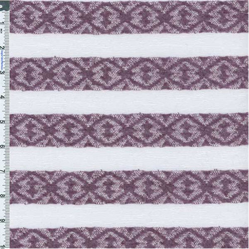 Stretch Poly Lacey-look Jacquard Knit Stripe Fabric By the Yard, Dusty Purple/White. See-through stretch knit, horizontal striped lacey-look motif alternating with slub textured stripe (not a print). Light as a feather, excellent drape, dry textured hand feel.