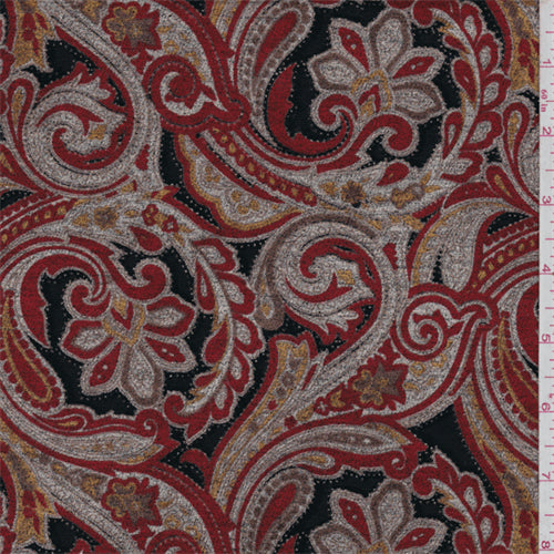 Crimson red, soft brown, black and orange gold with a faint sheen. A mid weight polyester and cotton blend fabric with a scroll design that is accented with metallic silver threads. Brushed surface and solid black back with a slightly slick hand/feel. Drapes in folds. Suitable for apparel, jackets, & home décor applications such as drapery or toss pillows. Dry clean only.