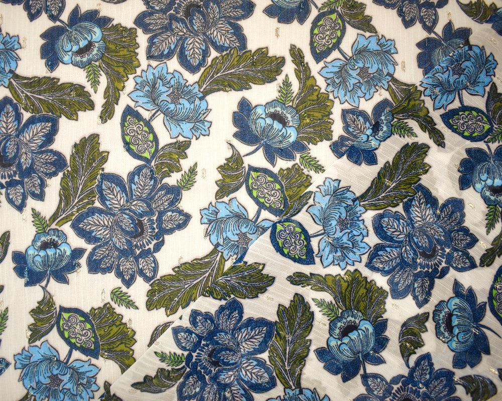Blue-Gold-Multi Floral Printed Metallic Crinkle Yoryu Chiffon Woven Fabric
