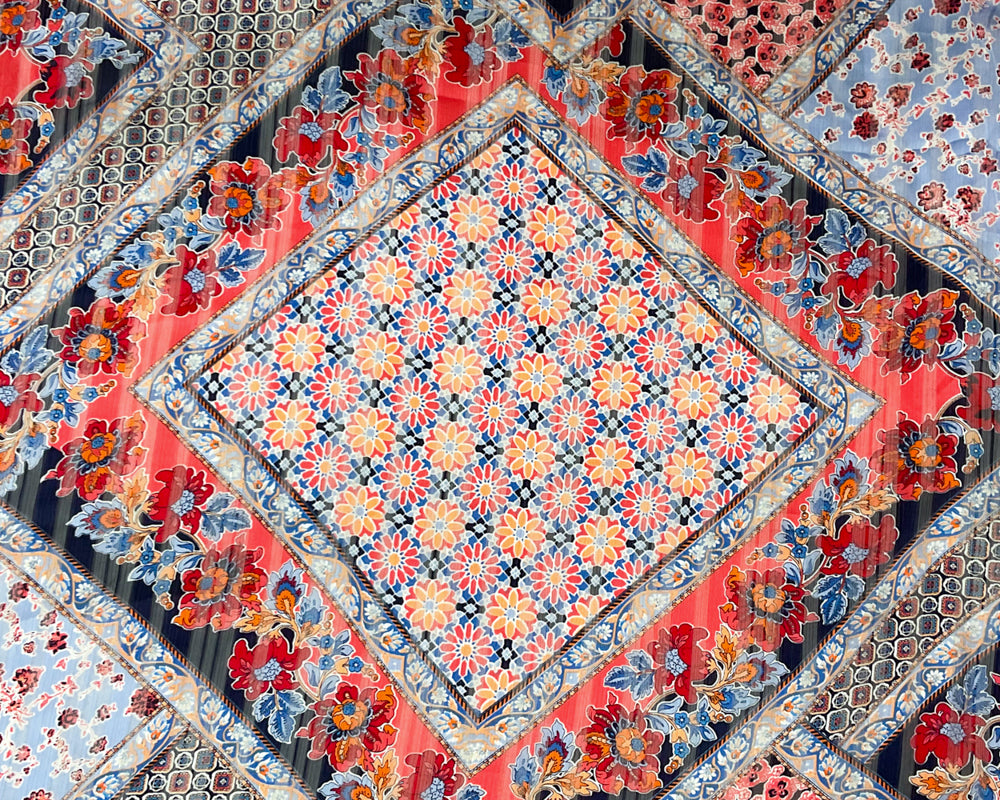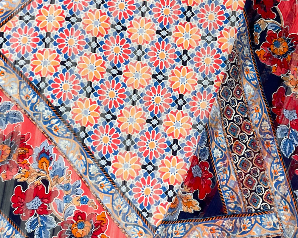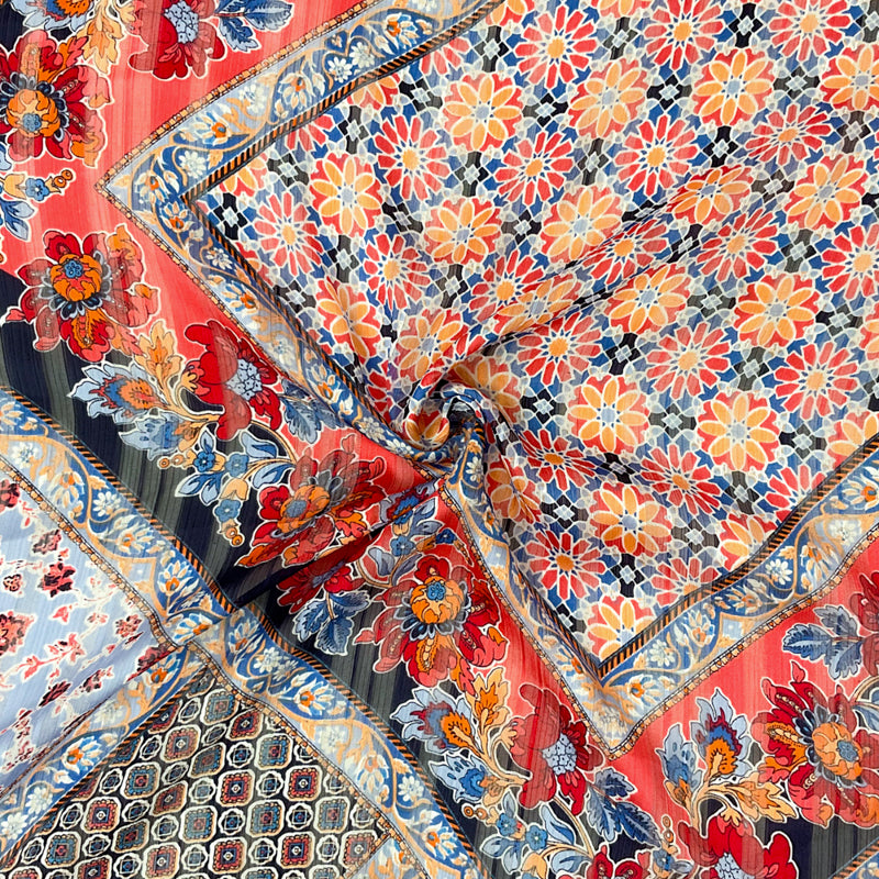 Blue-Multi Poly Floral Printed Satin Stripe Chiffon Woven Fabric