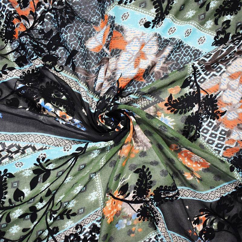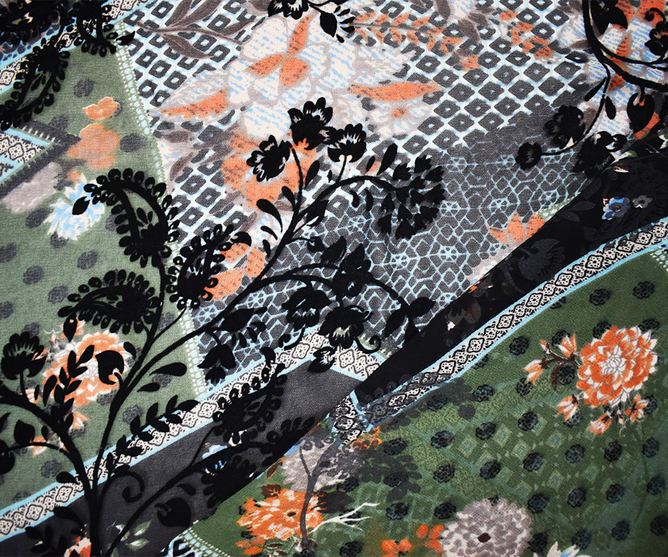 Green-Multi Poly Patch Floral Velvet Flocked Chiffon Woven Fabric