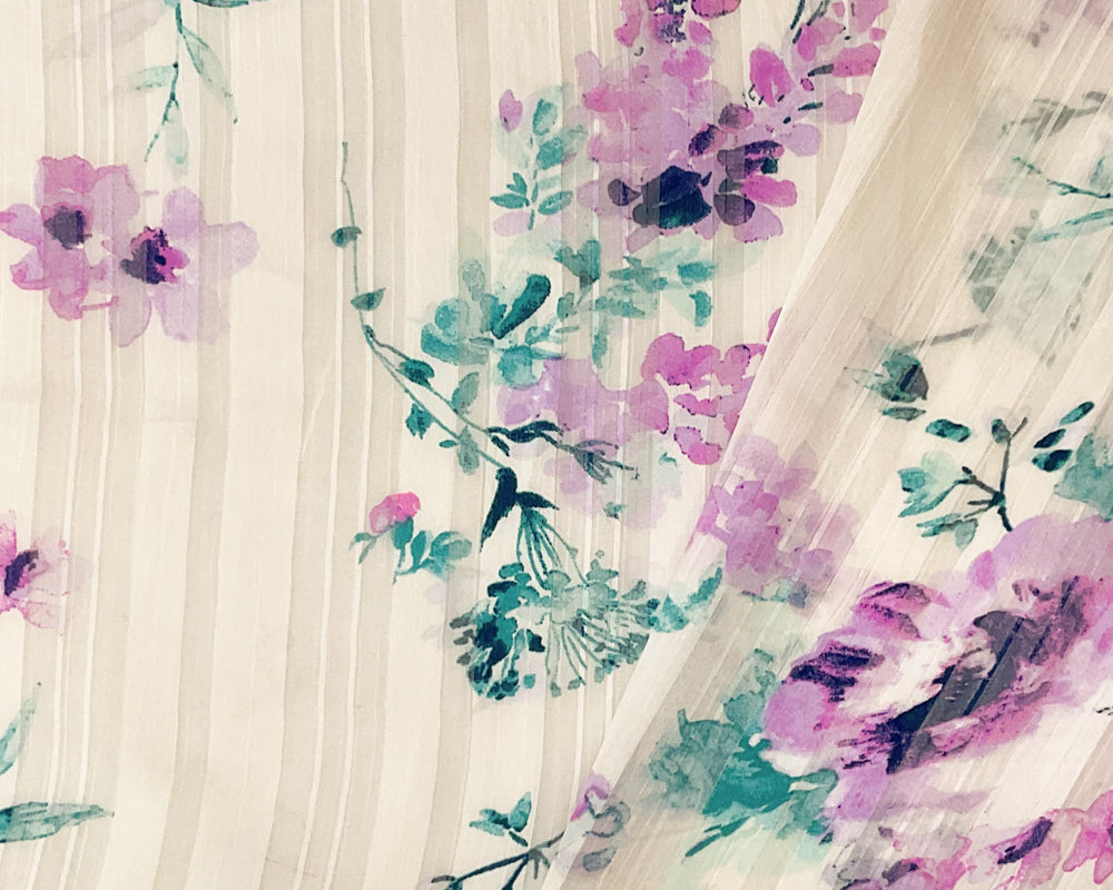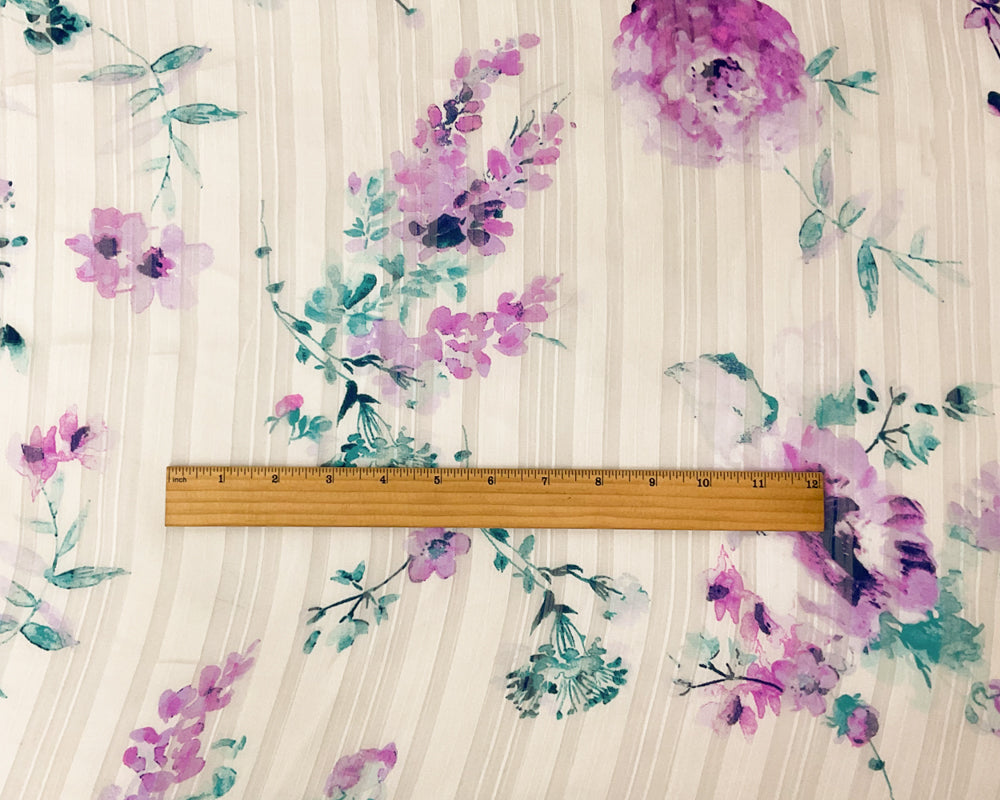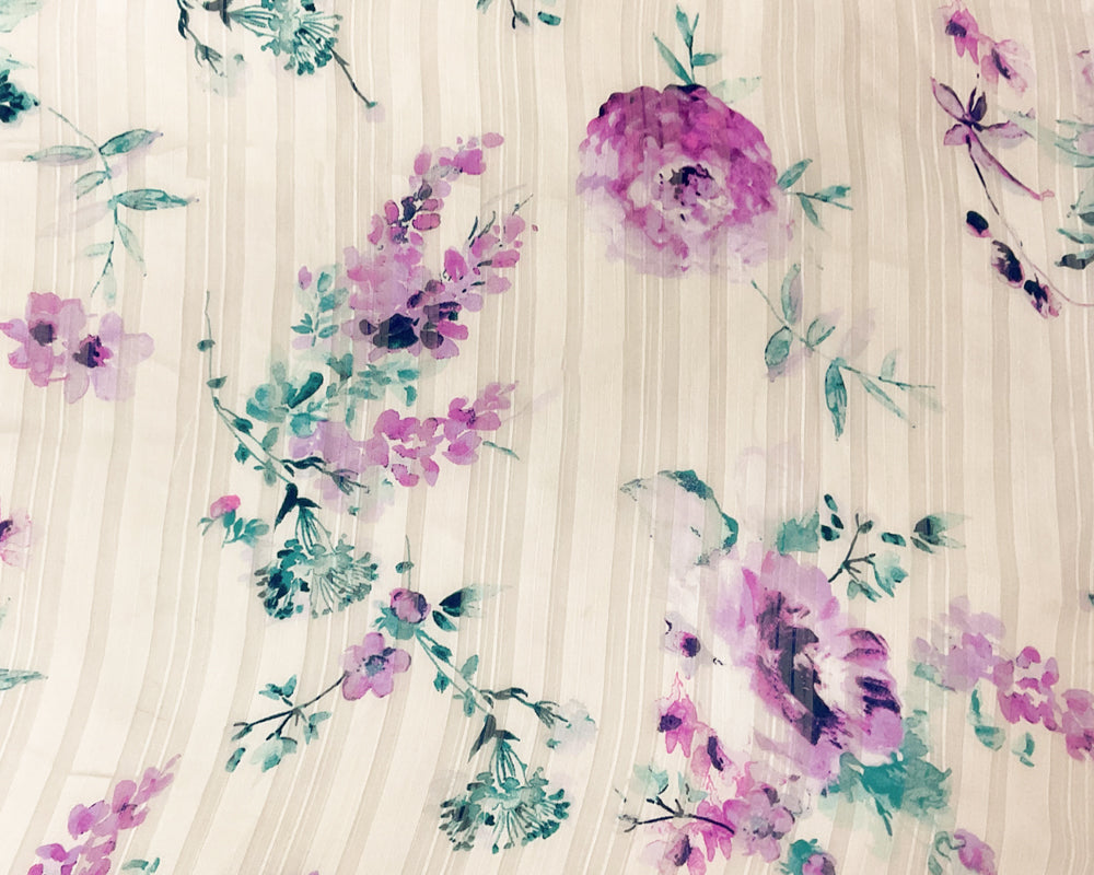 -Off-White-Multi Floral Printed Satin Stripe Chiffon Woven Fabric