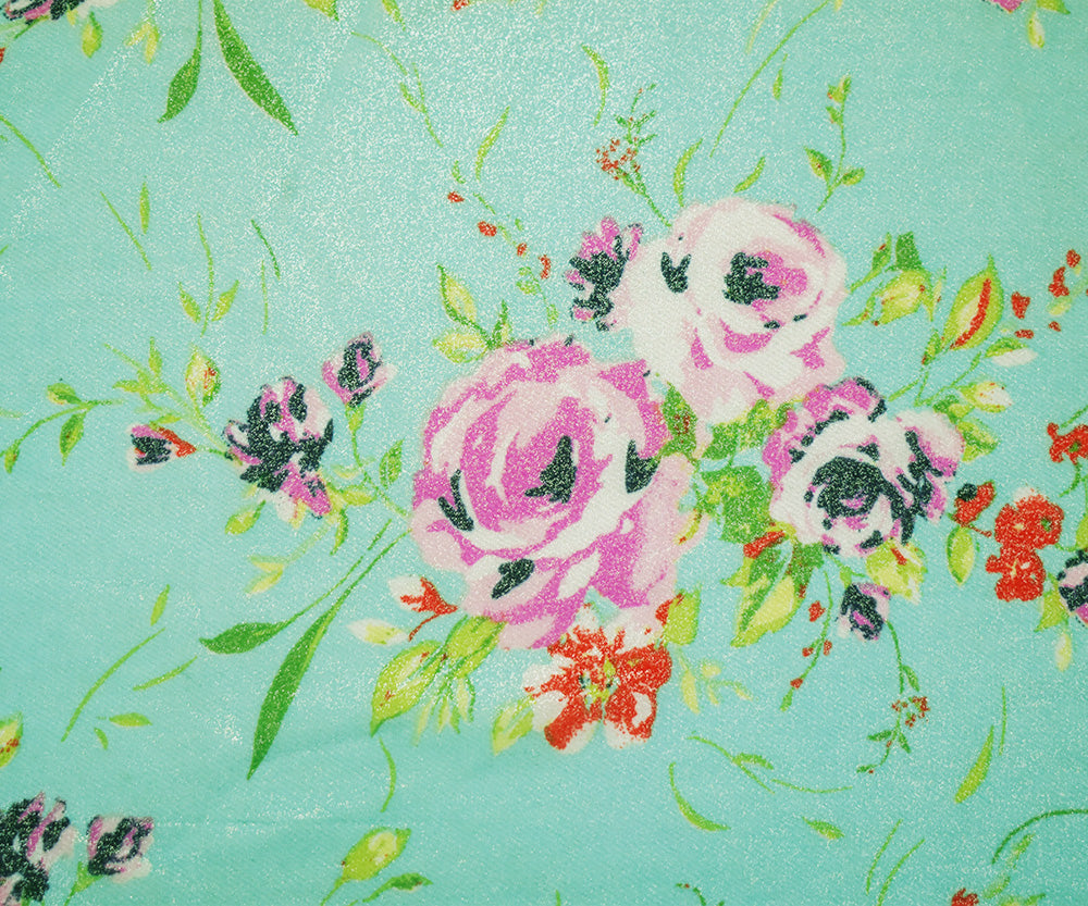 -100% Polyester chiffon woven fabric printed with florals and overprinted with silver metallic sparkly-like texture for that added shine