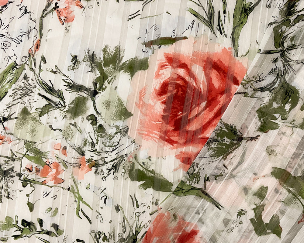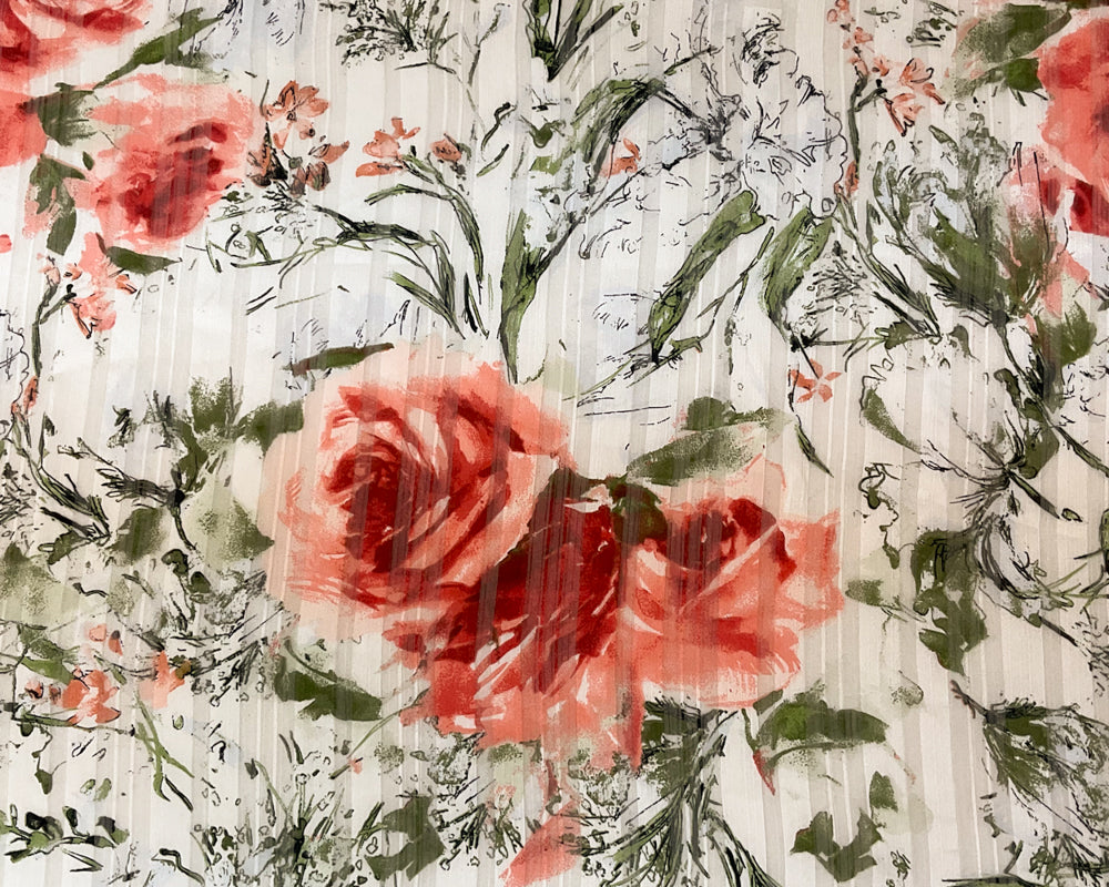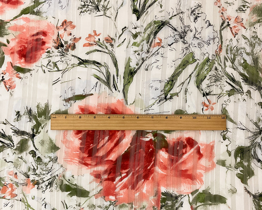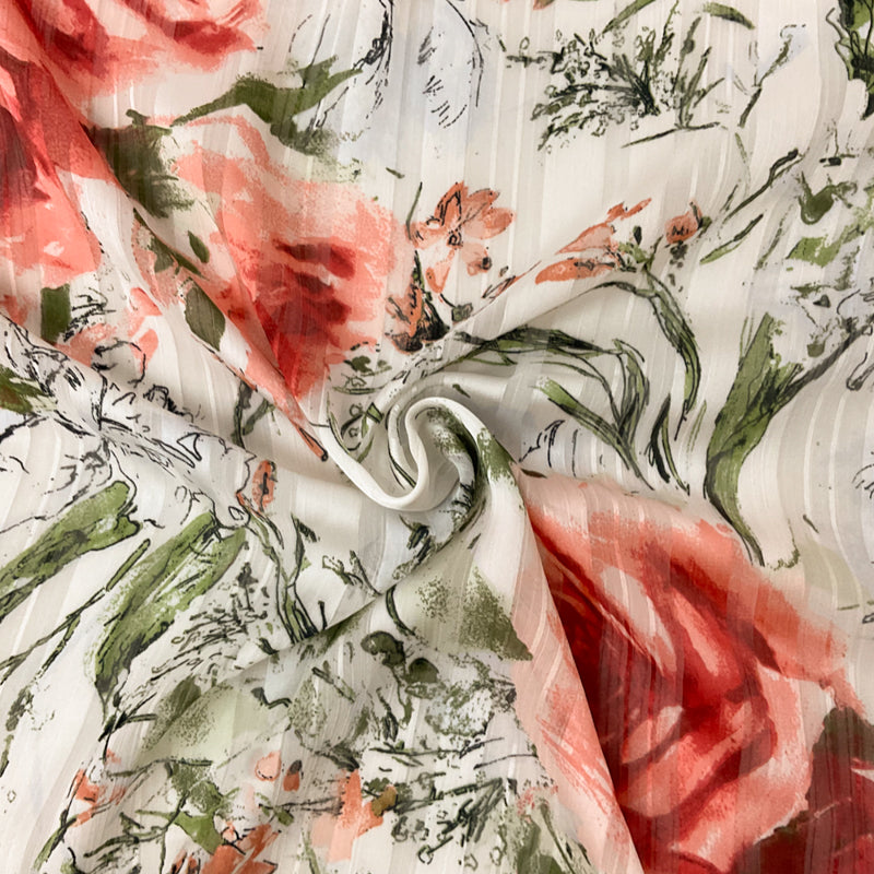 White-Multi Poly Floral Printed Satin Stripe Chiffon Woven Fabric