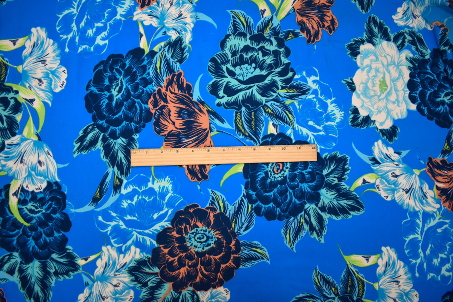Blue-Turquoise-Multi Poly Floral Print Pebble Crepe Woven Fabric