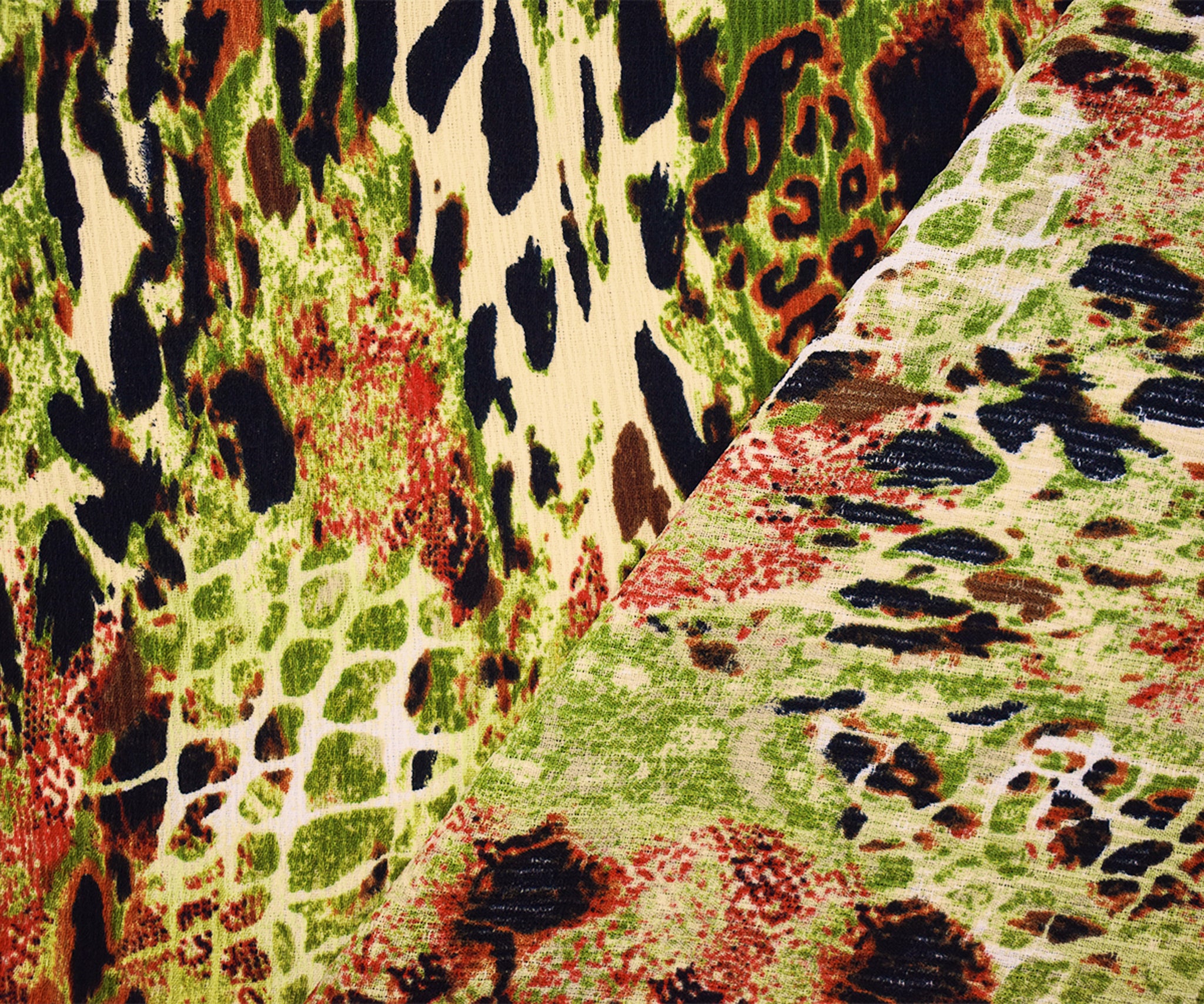 Green-Brown-Multi Poly Abstract Animal Printed Textured Crepe Woven Fabric