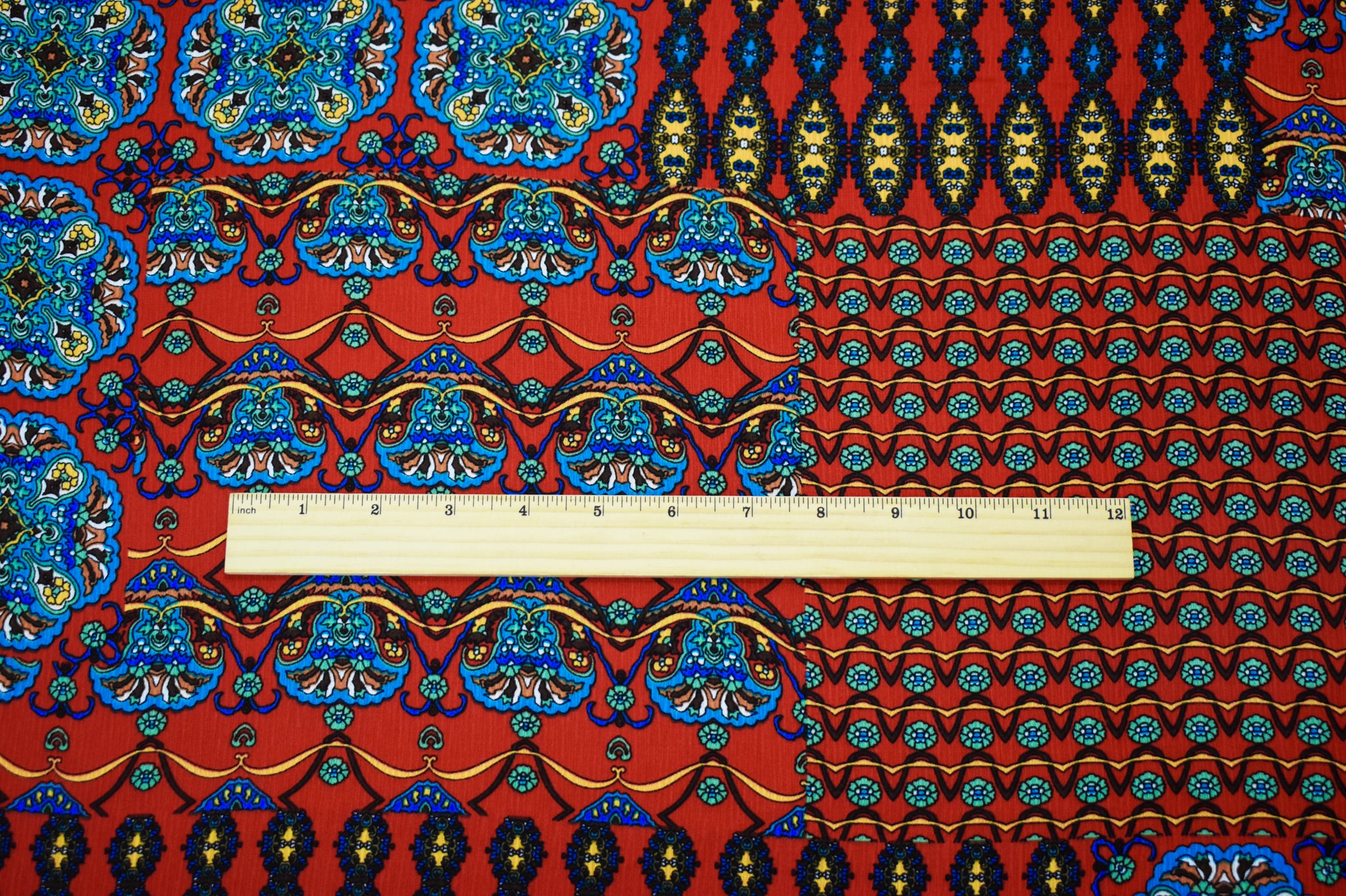 Orange-Teal Mandala Border Multi Pattern Printed Crinkle Crepe Woven Fabric