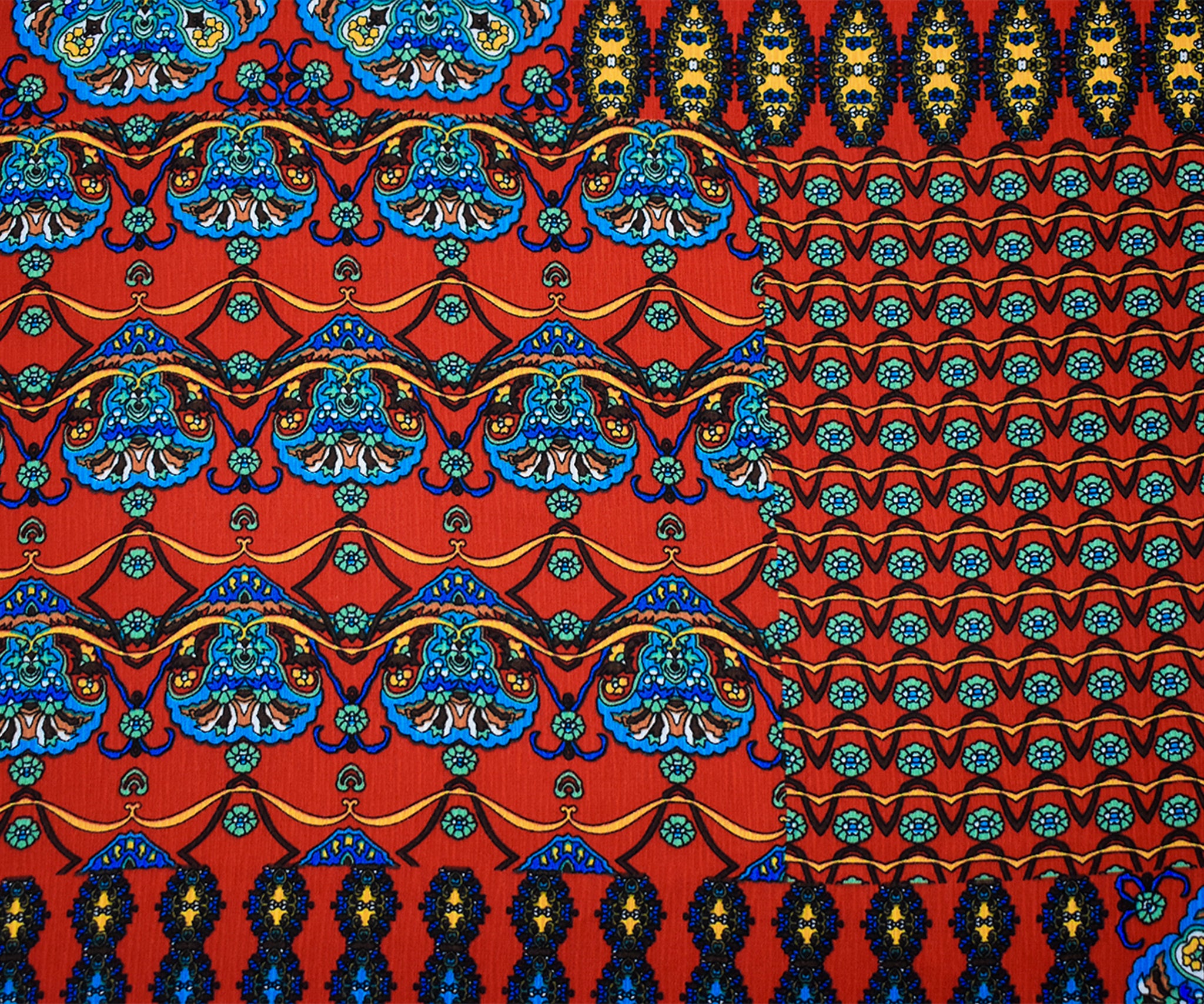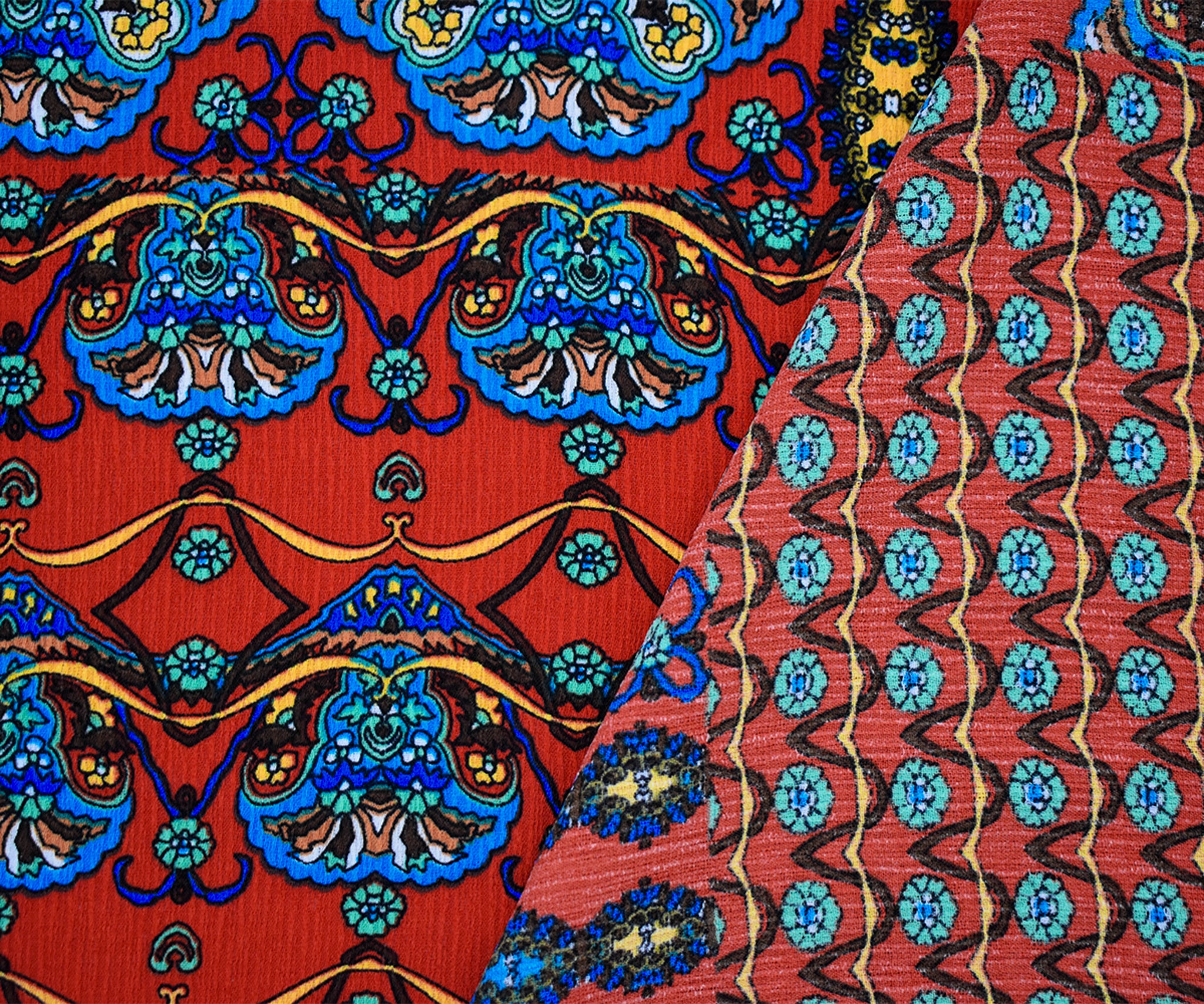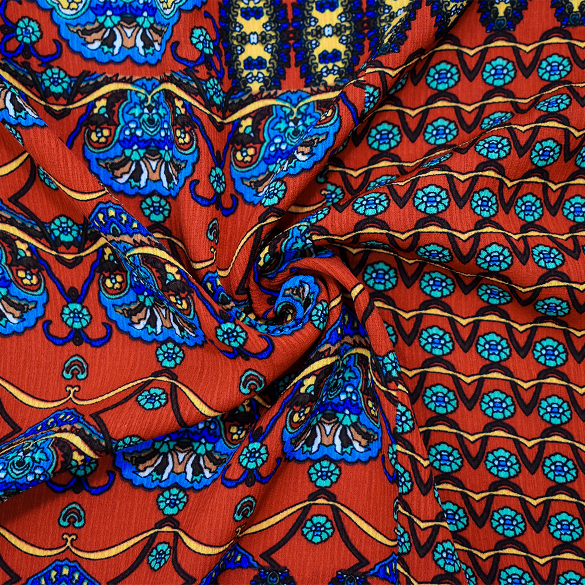 -100% Polyester crinkled crepe dobby woven fabric printed with a bordered pattern with mandala, floral, and pendant inspired elements