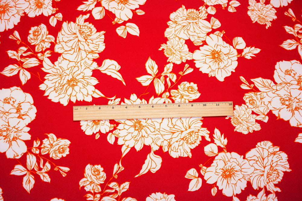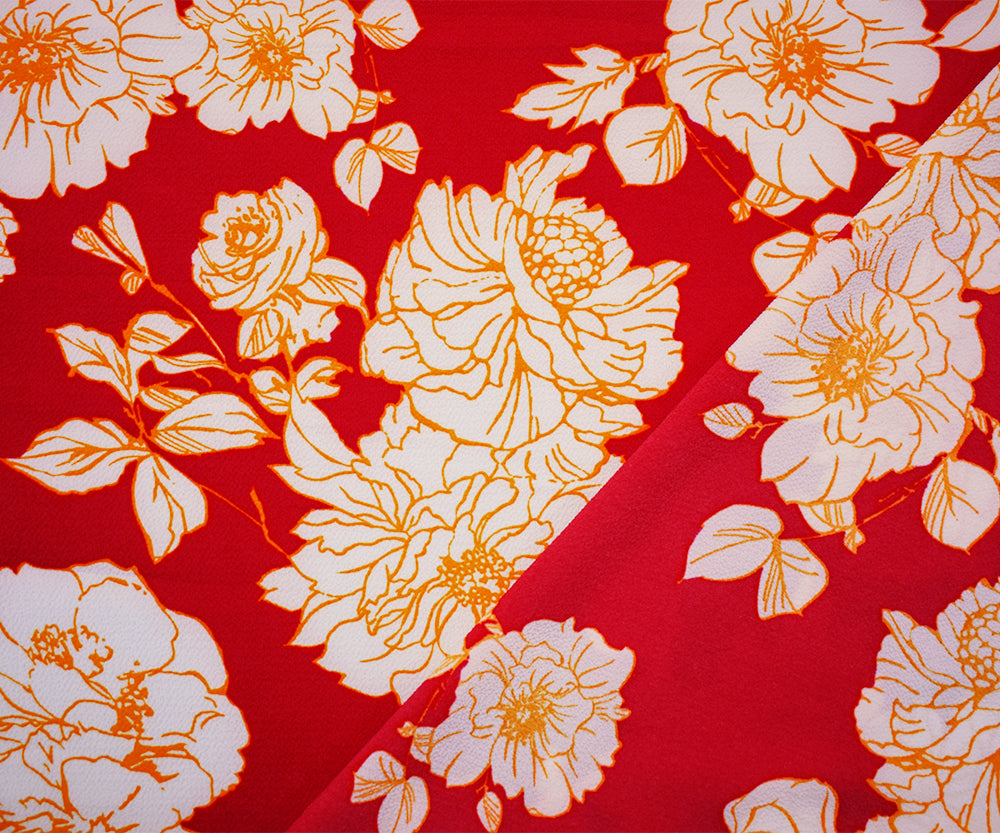 Red-Orange-White Poly Floral Printed Pebble Crepe Woven Fabric