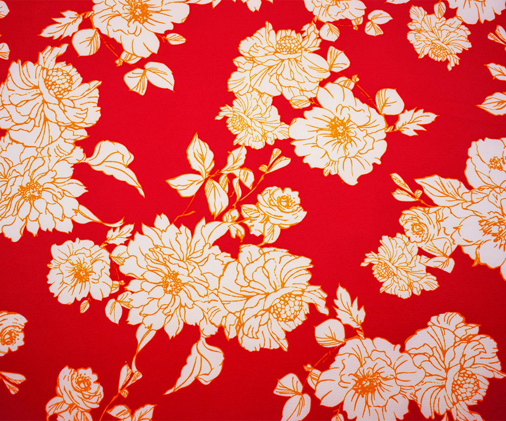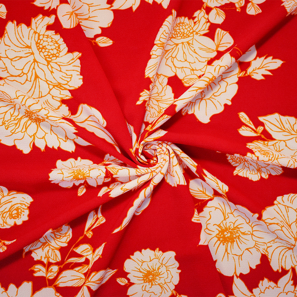 -Red-Orange-White Poly Floral Printed Pebble Crepe Woven Fabric