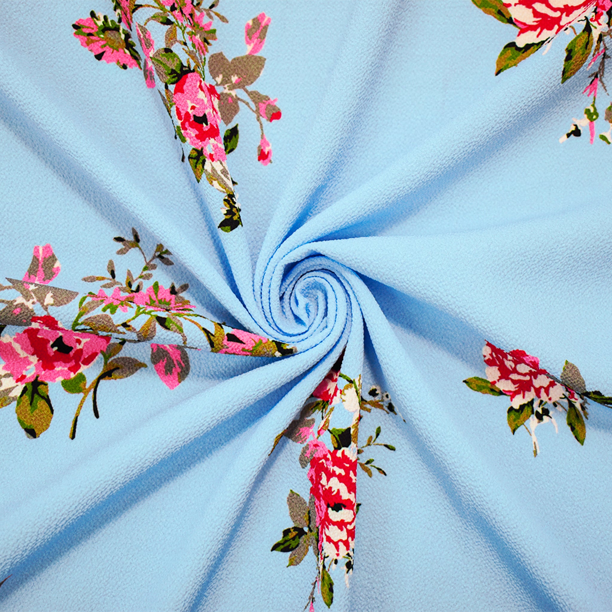 Sky Blue-Pink-Multi Poly Floral Printed Pebble Crepe Woven Fabric