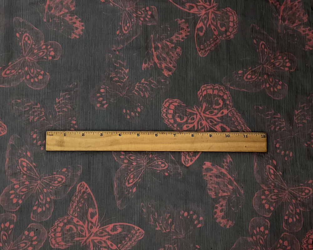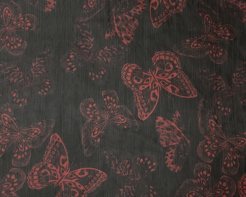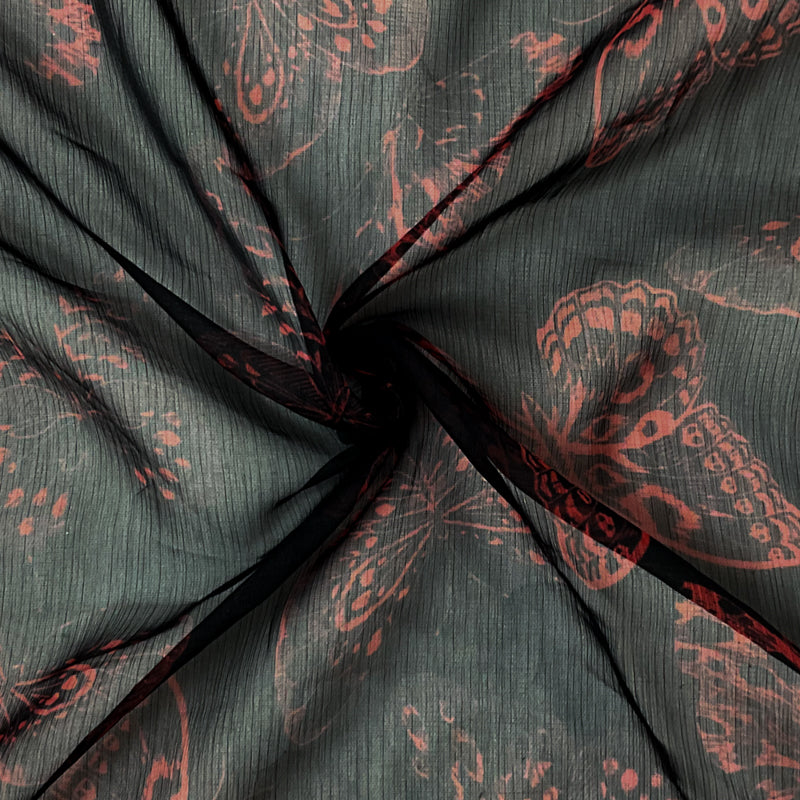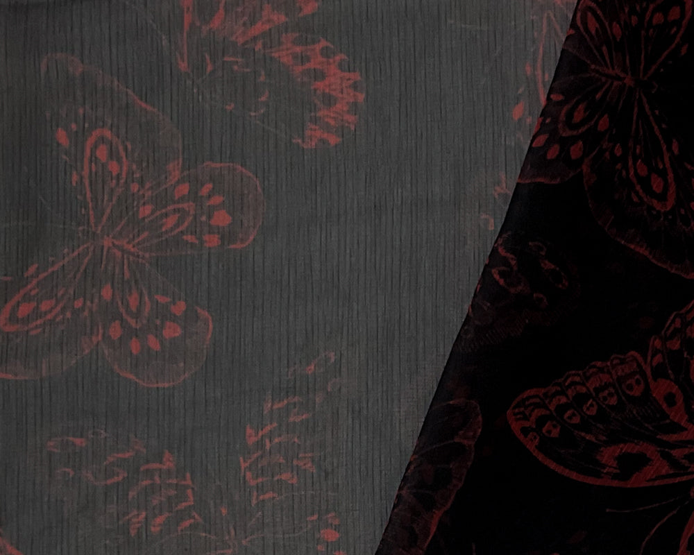 Black-Red Poly Butterfly Printed Yoryu Chiffon Woven Fabric
