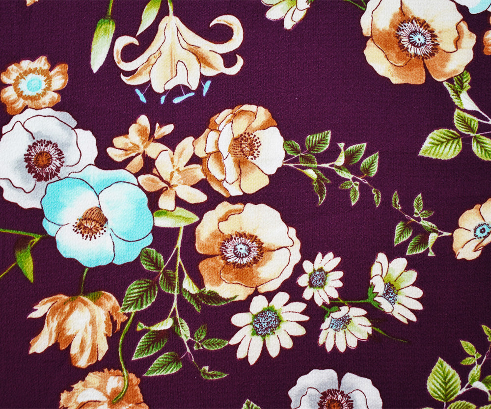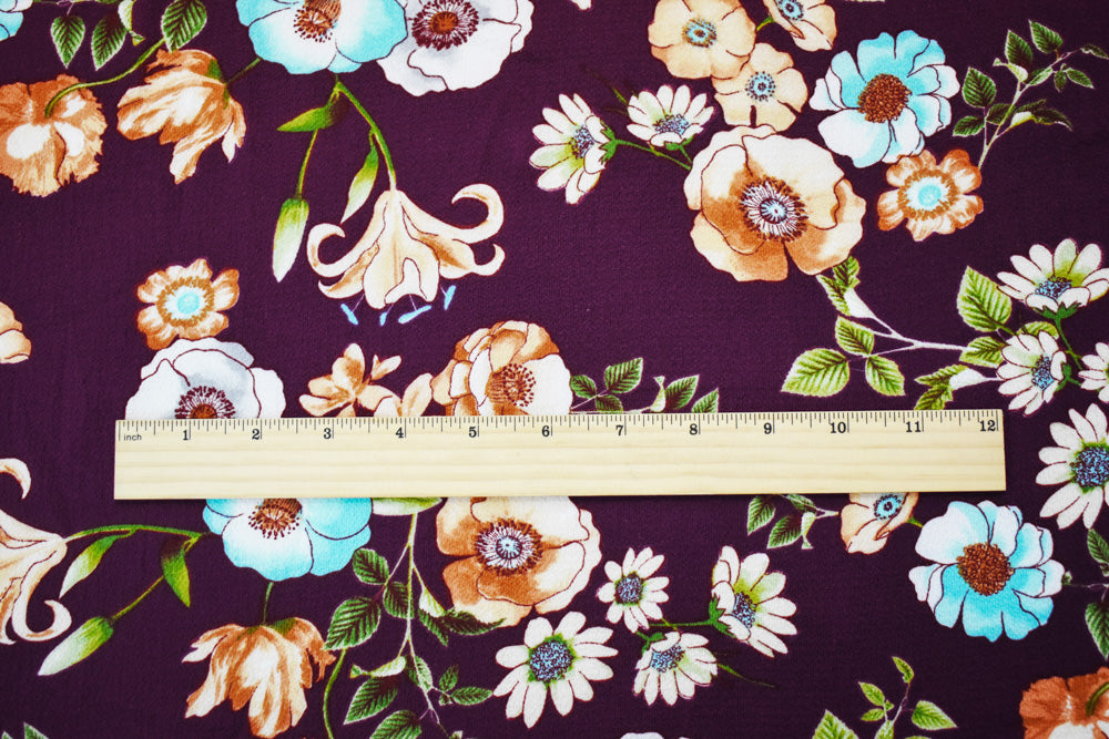 1 YD PC-Burgundy Red-Brown-Multi Poly Floral Printed Pebble Crepe Woven Fabric