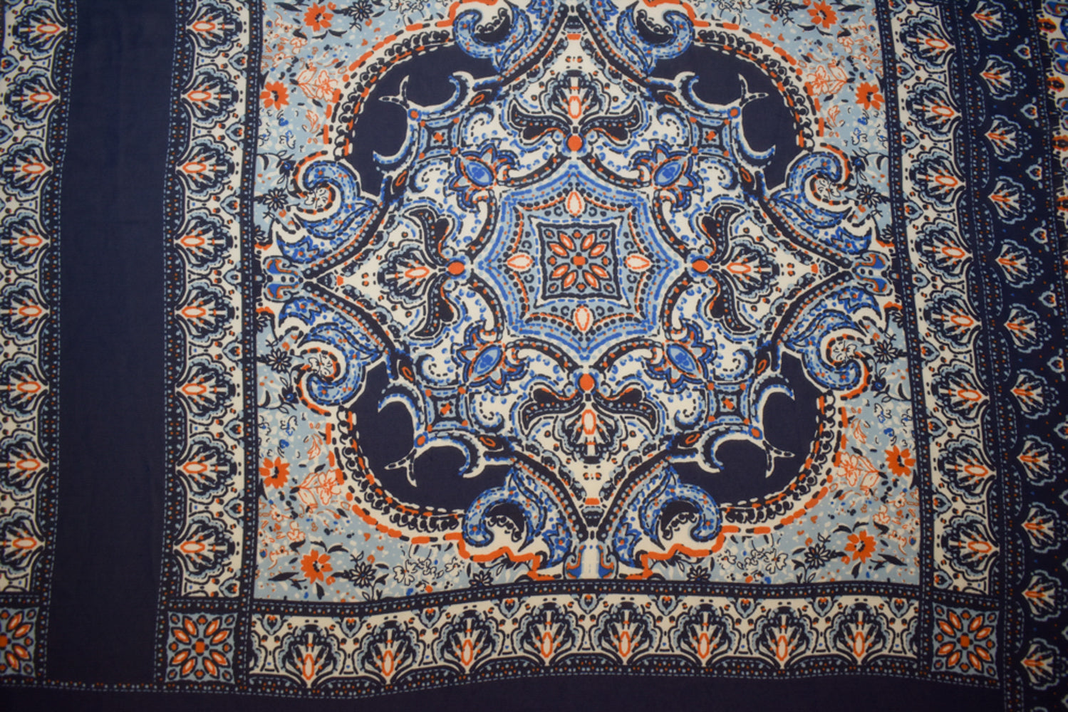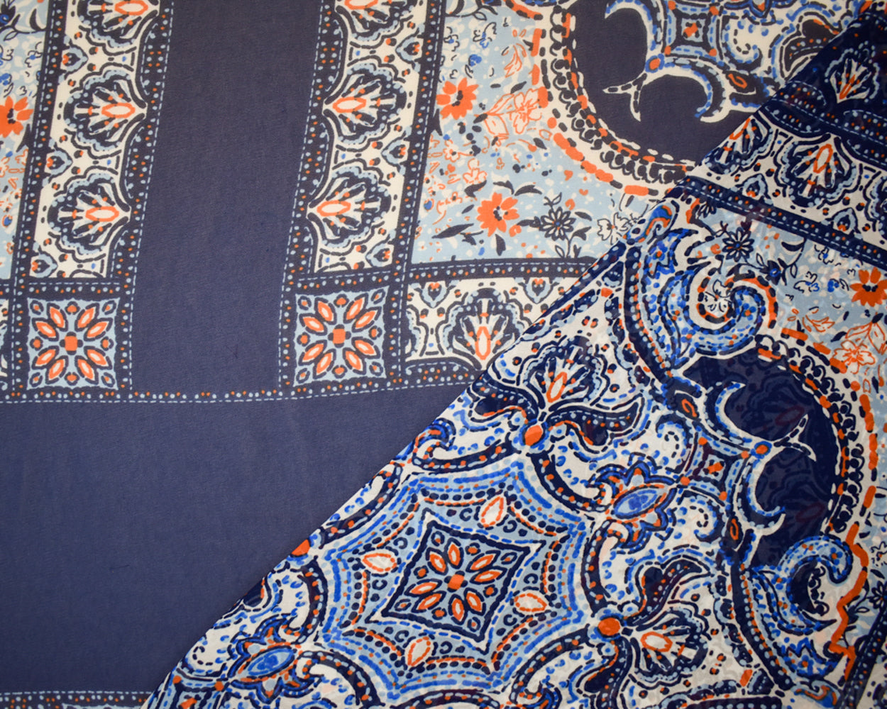 4 YD PC-Blue-White-Orange Poly Moroccan Bandana PANEL Printed Chiffon Woven Fabric