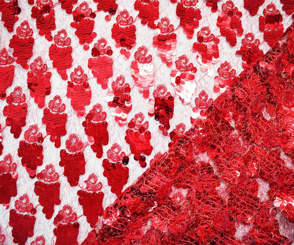-Polyester and metallic crochet lace knit fabric designed with clusters of sequins.