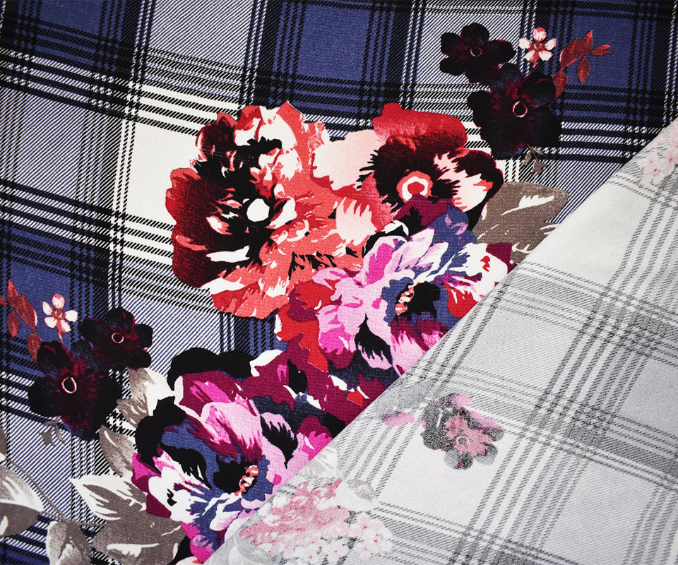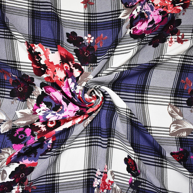 Red-Multi Poly Floral Plaid Printed Moss Crepe Woven Fabric