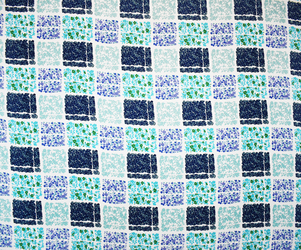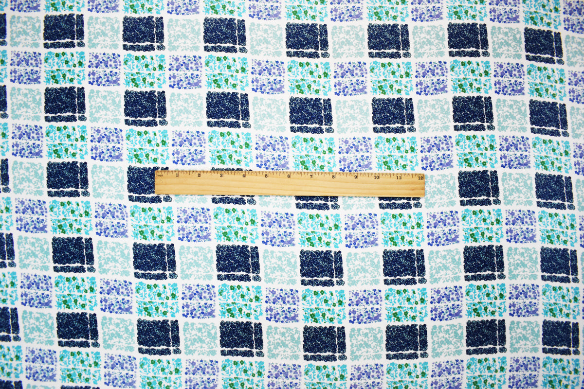 Turquoise Poly Check Floral Plaid Printed Moss Crepe Woven Fabric