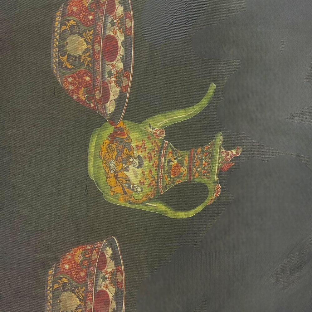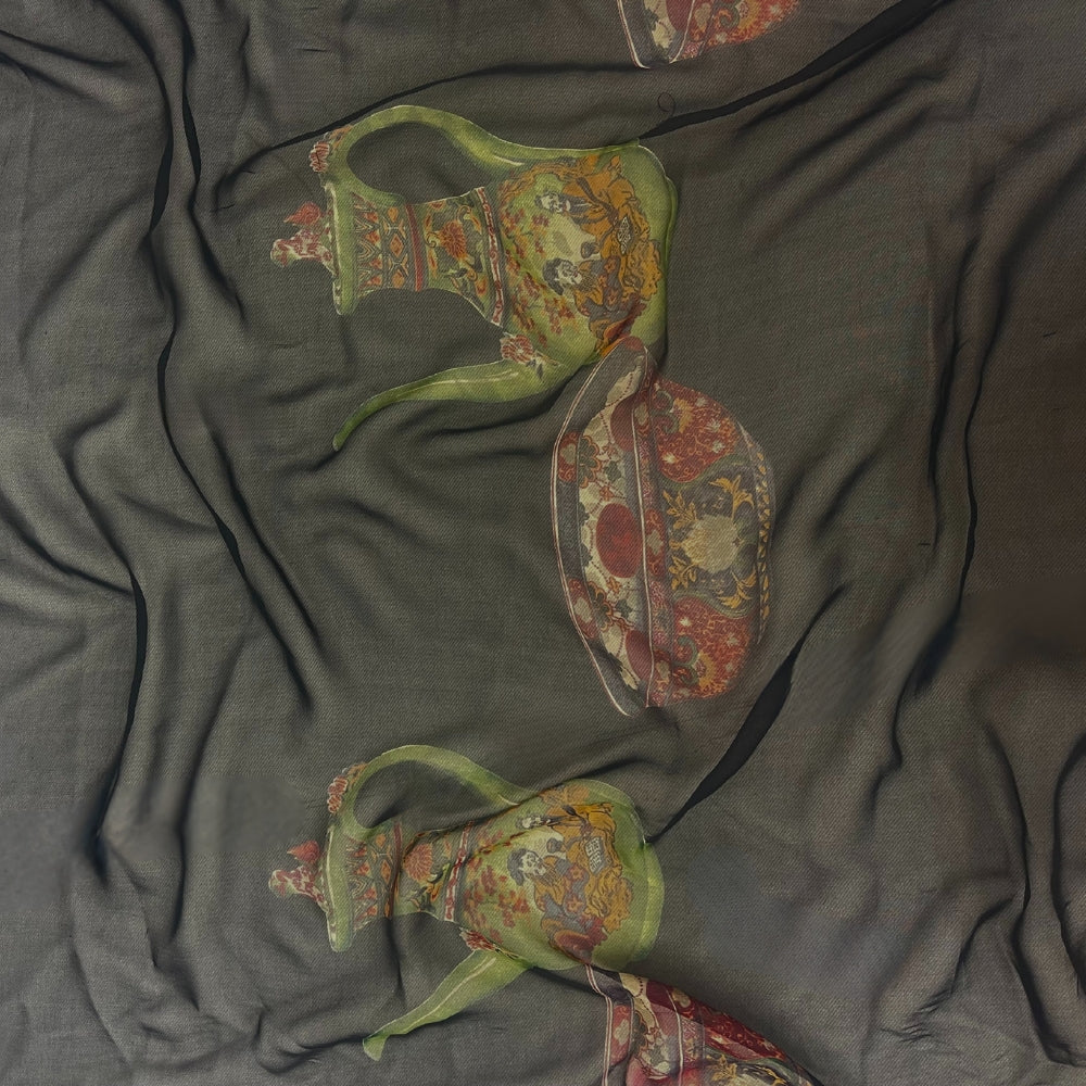 Black-Green-Multi Tea Set Printed Chiffon Panel Woven Fabric