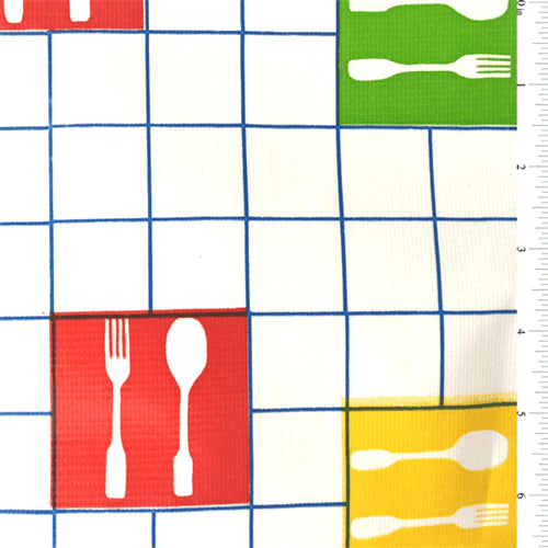 Red, Blue, Green, and Yellow Picnic Print on White Oilcloth Fabric