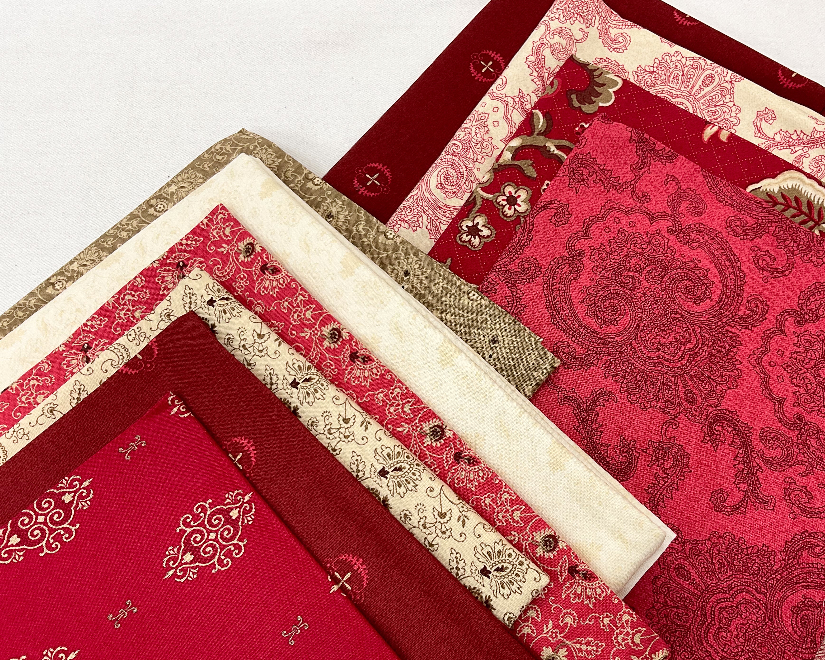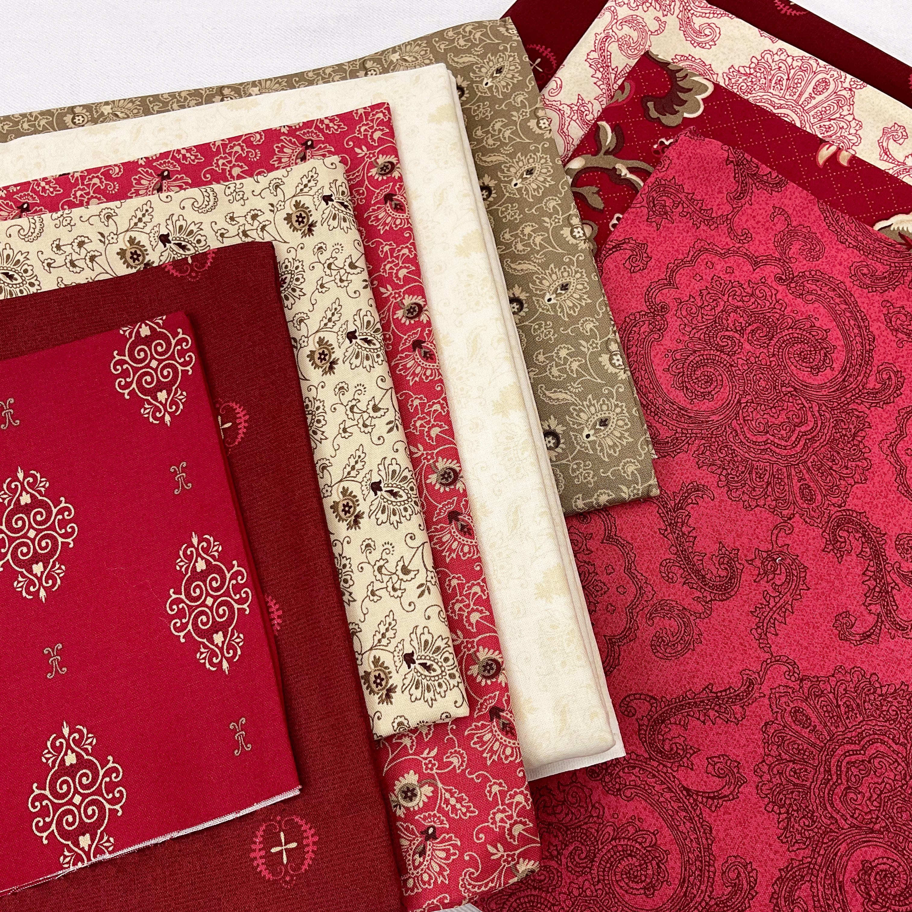 - Bundle fabrics include: 1 yd brown beige floral, 2 yds red beige floral, 3/4 yd red beige leaf floral, 1 5/8 yd red beige cross, 1 yd red beige baroque, 3/4 yd red beige cross, 7/8 yd brown beige leaf floral 7/8 yd red black baroque, 3/8 yd red beige crest, 3 yds tonal floral leaf. Pattern is not included
