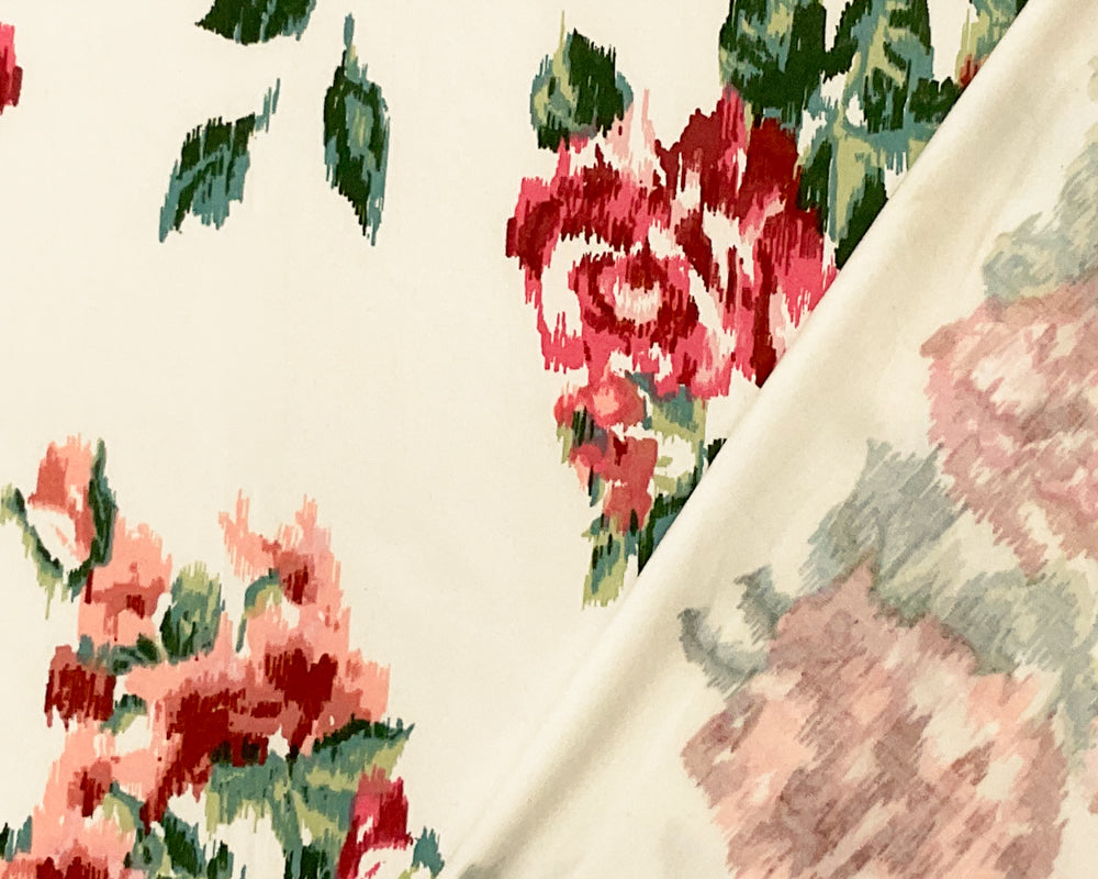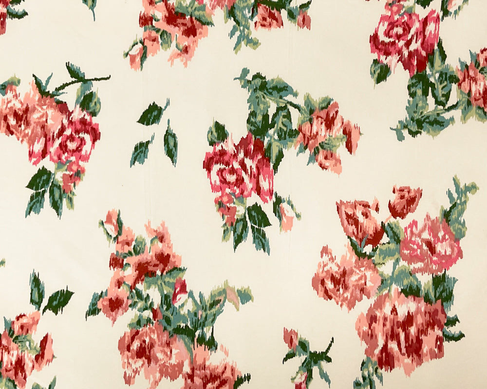 Color: Coral Pink with Peach Undertones, Ivory, Green, Red, Mauve Pink