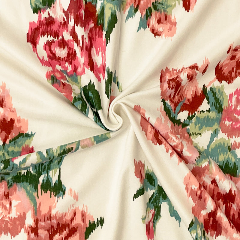 Coral-Multi Poly Stretch Floral Ikat Print DB Jersey Knit Fabric