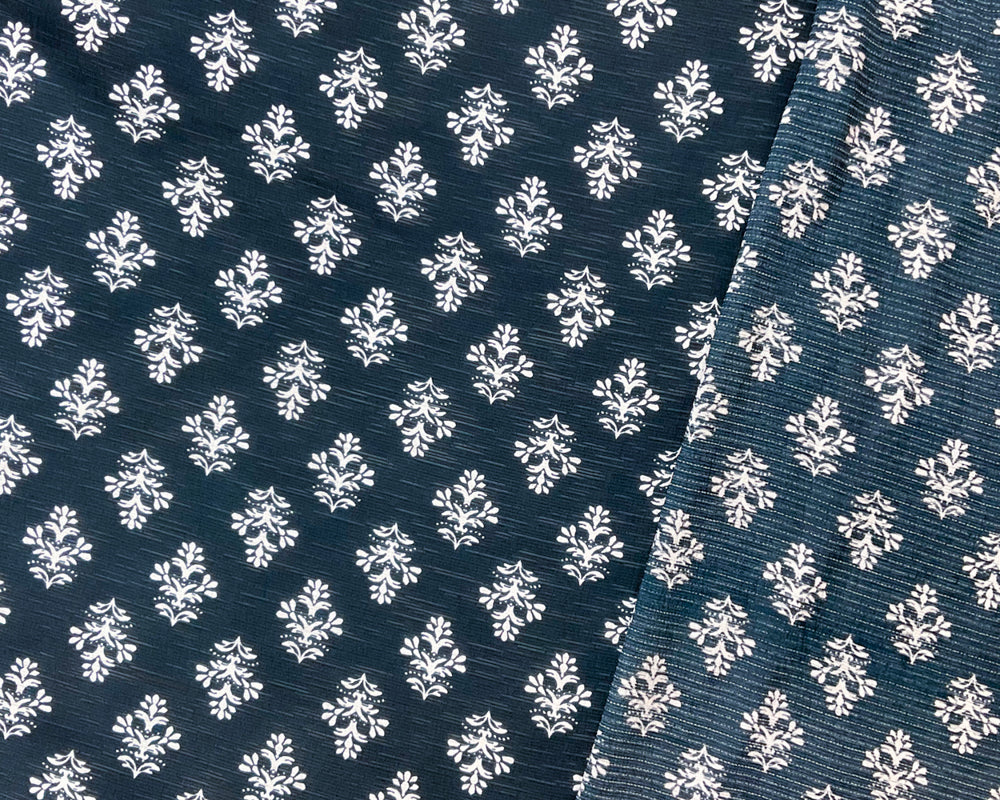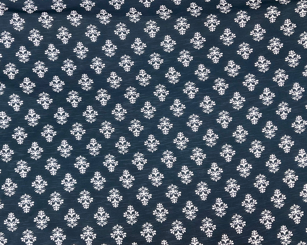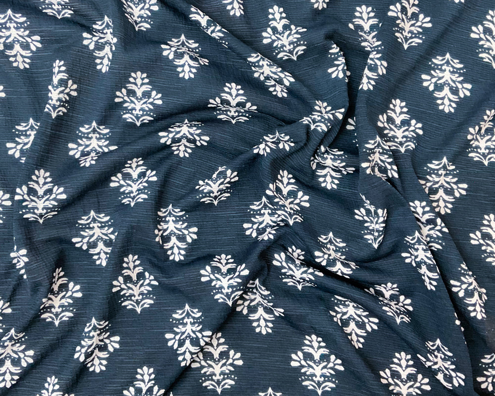 -Blue-White Poly Stretch Spandex Damask Floral Inspired Pattern Printed Slub Knit Fabric
