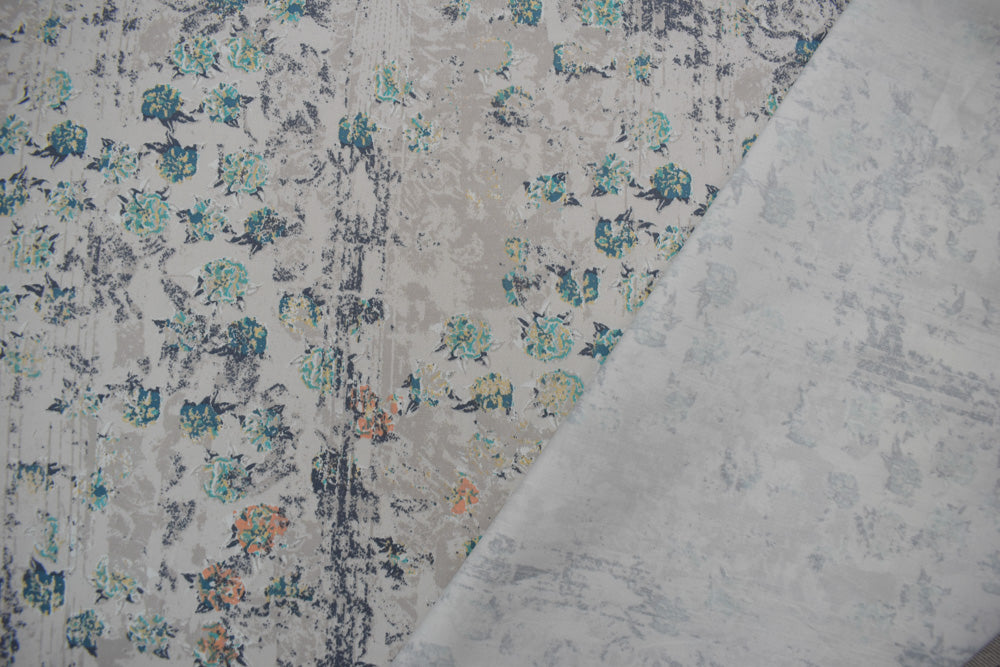 -Cotton stretch spandex twill sateen-like woven fabric printed with a floral pattern and a textured-like abstract surface. Made in Korea.