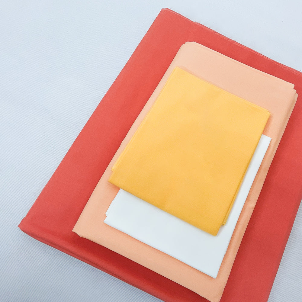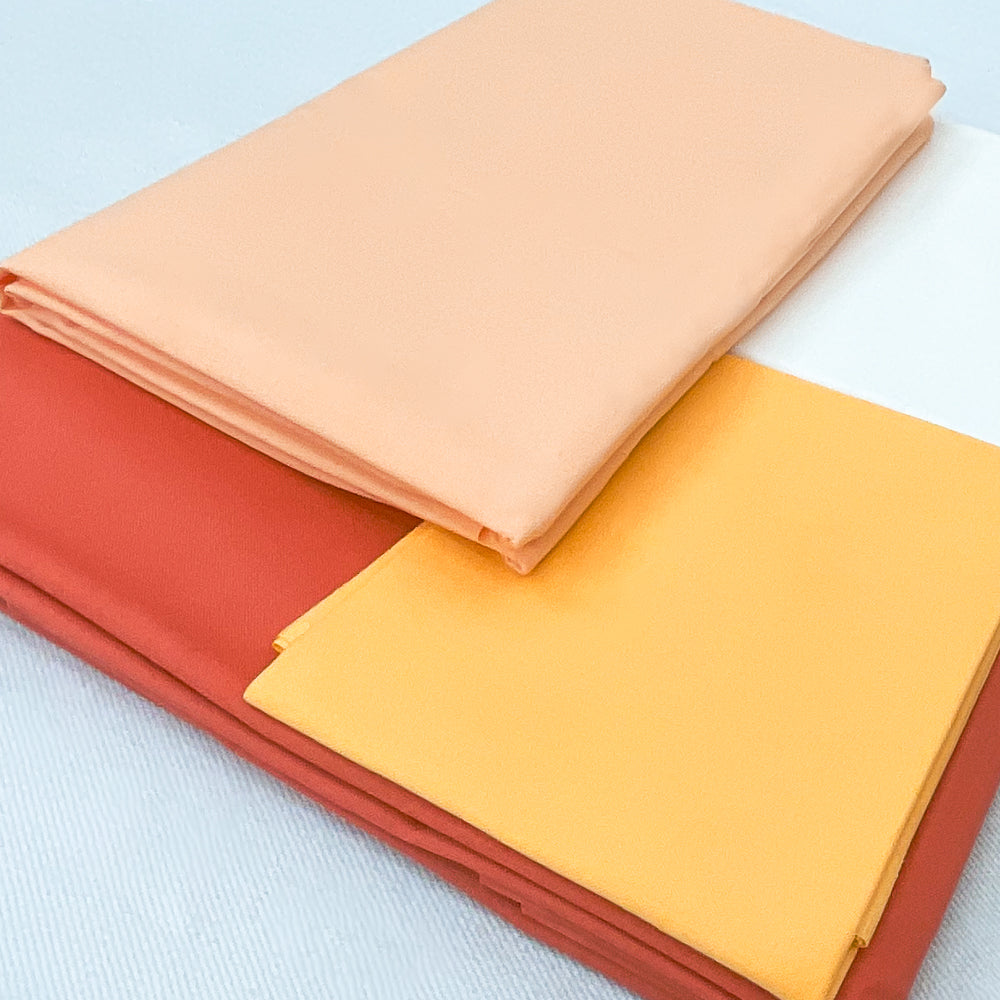 - Bundle fabrics include: 1 1/4 yards peach solid, 1/4 yard yellow solid, 1/4 yard white solid, 2 yards deep salmon orange. Pattern is not included.