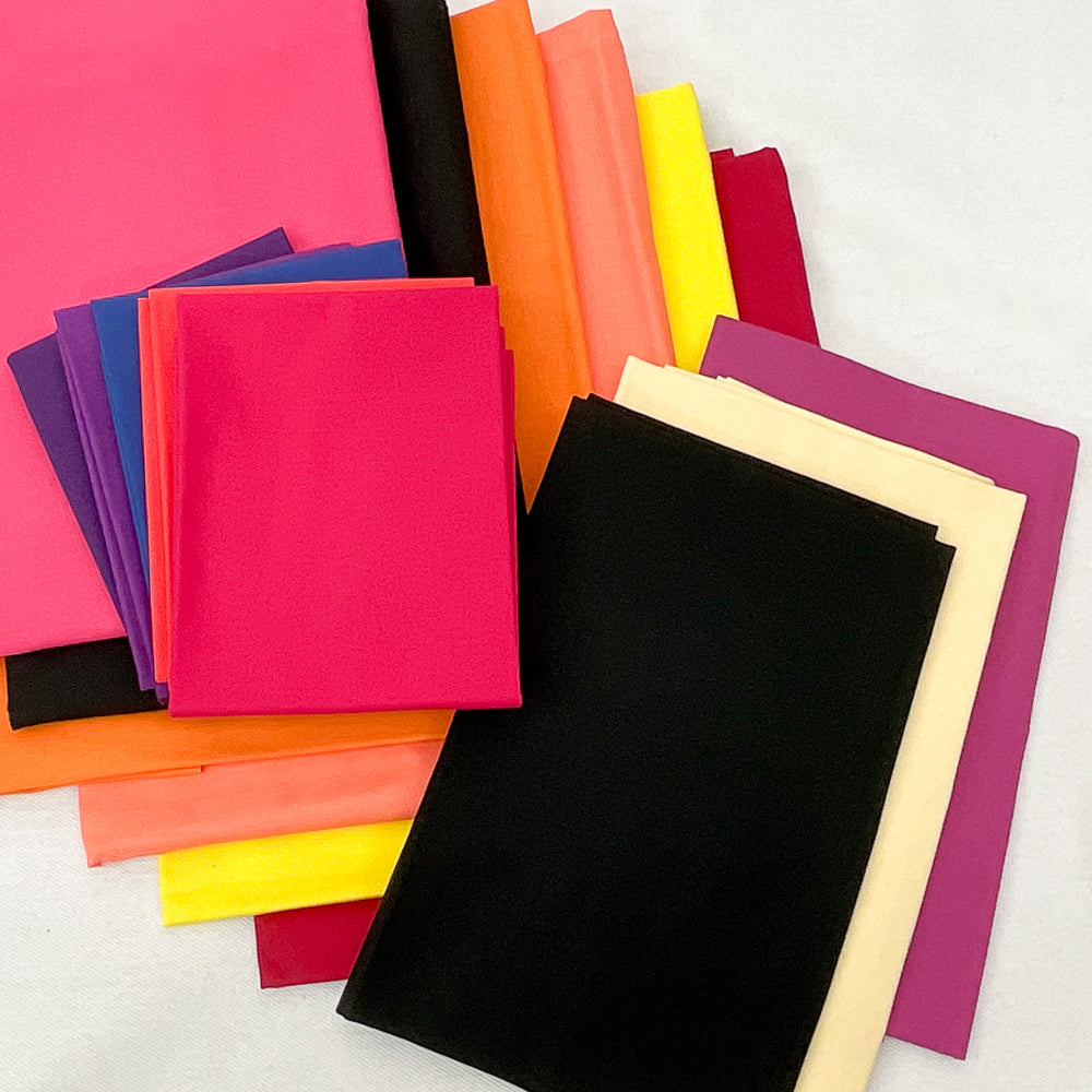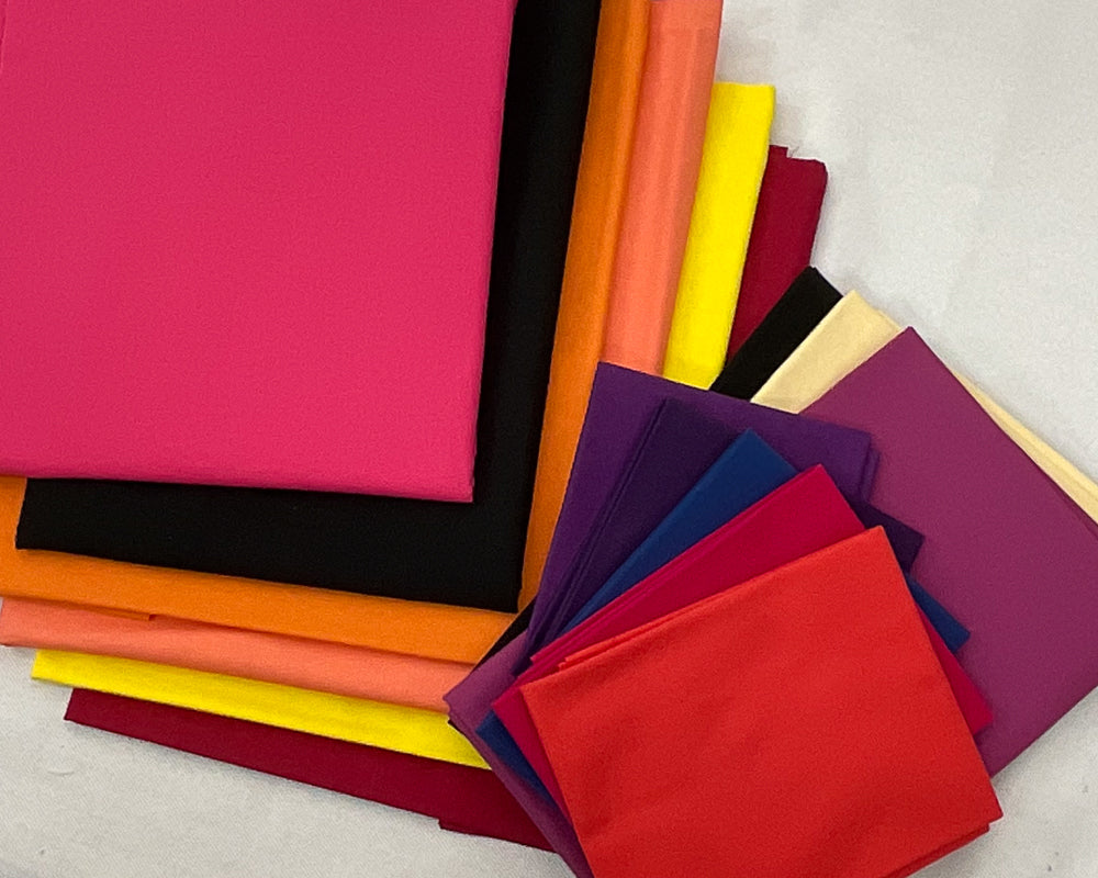 - Bundle fabrics include: 1/4 yd purple solid, 1/4 yd dark purple solid, 1/4 yd dark blue solid, 1/4 yd red solid, 1/4 yd pink solid, 1/2 yd black solid, 1/2 yd light yellow solid, 1/2 yd lilac purple solid, 1 yd hot pink solid, 3/4 yd red solid, 3/4 yd bright yellow solid, 1 yard coral orange solid, 1 yard orange solid, 1 1/8 yd black solid. Pattern is not included. Pattern can be purchased from Violet Craft at https://www.violetcraft.com/lion