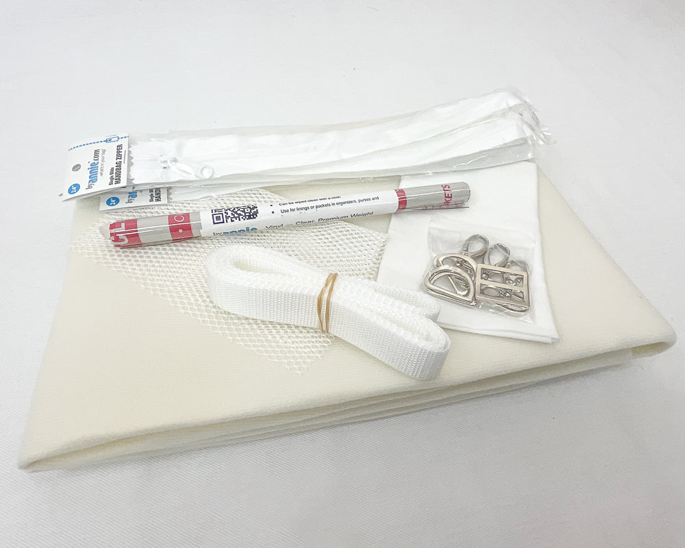 - 4, 24" white zippers, 1 pc premium weight vinyl, 1 pc mesh fabric, white webbing, 1 pc Shape Flex fusible interfacing, 1" nickel hardware set including d-rings and swivel hooks, 1 piece 14"x50" Foam fabric stabilizer