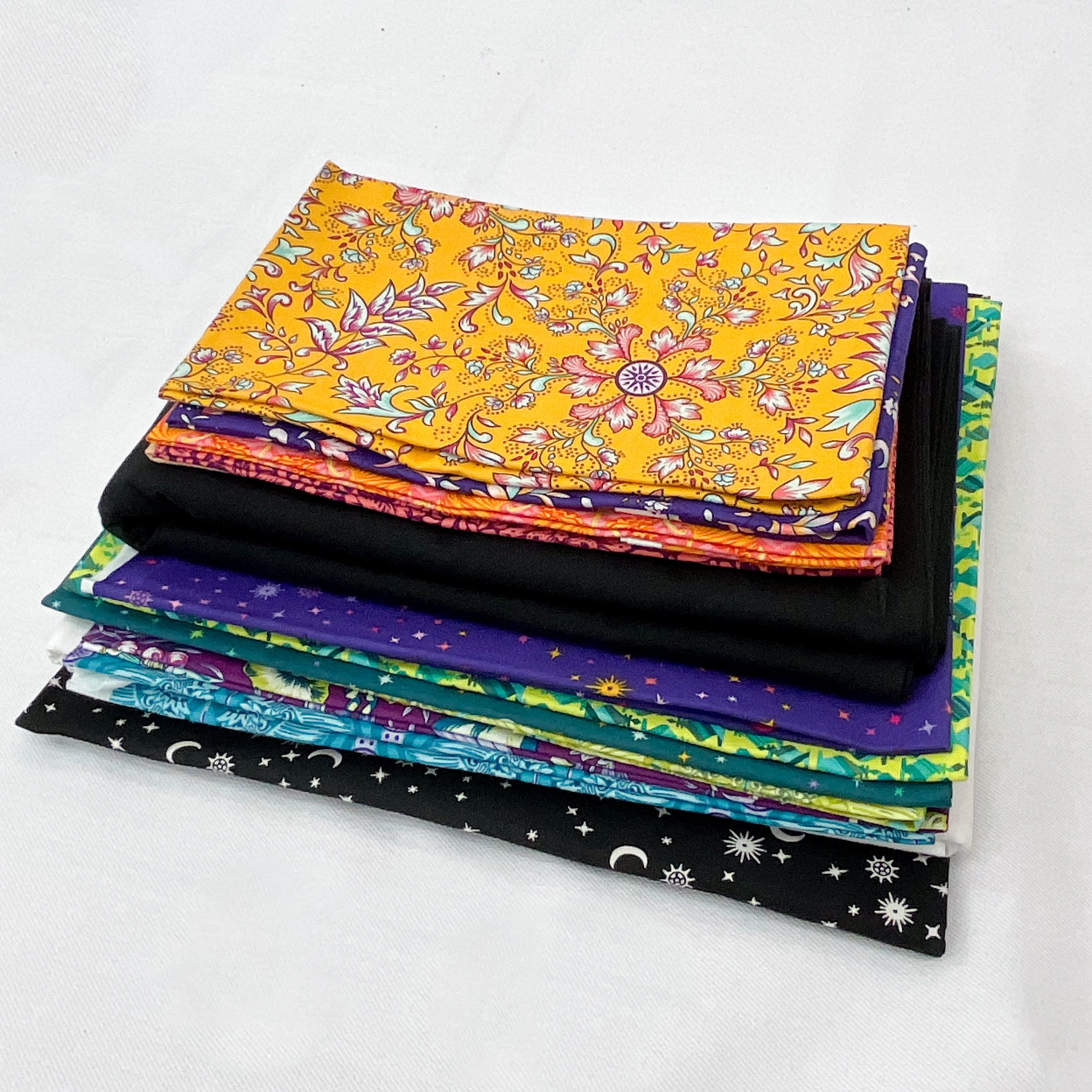 - Bundle fabrics include: 1/2 yd purple/multi moon/stars, 5/8 yd yellow/teal abstract, 5/8 yd green/multi moon/stars, 3/8 yd yellow/teal crossbow, 3/8 yd purple/multi floral, 1/2 yd teal/purple crossbow, 1/4 yd purple multi floral, 1/4 yd purple diamond abstract, 1/4 yd yellow multi floral, 1/4 yd purple coral floral, 1/4 yd orange multi crossbow, 1 1/4 yd black white moon/stars, 2 yds white solid, 3 yds black solid. Pattern is not included