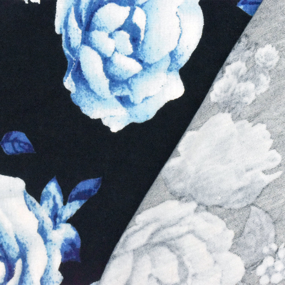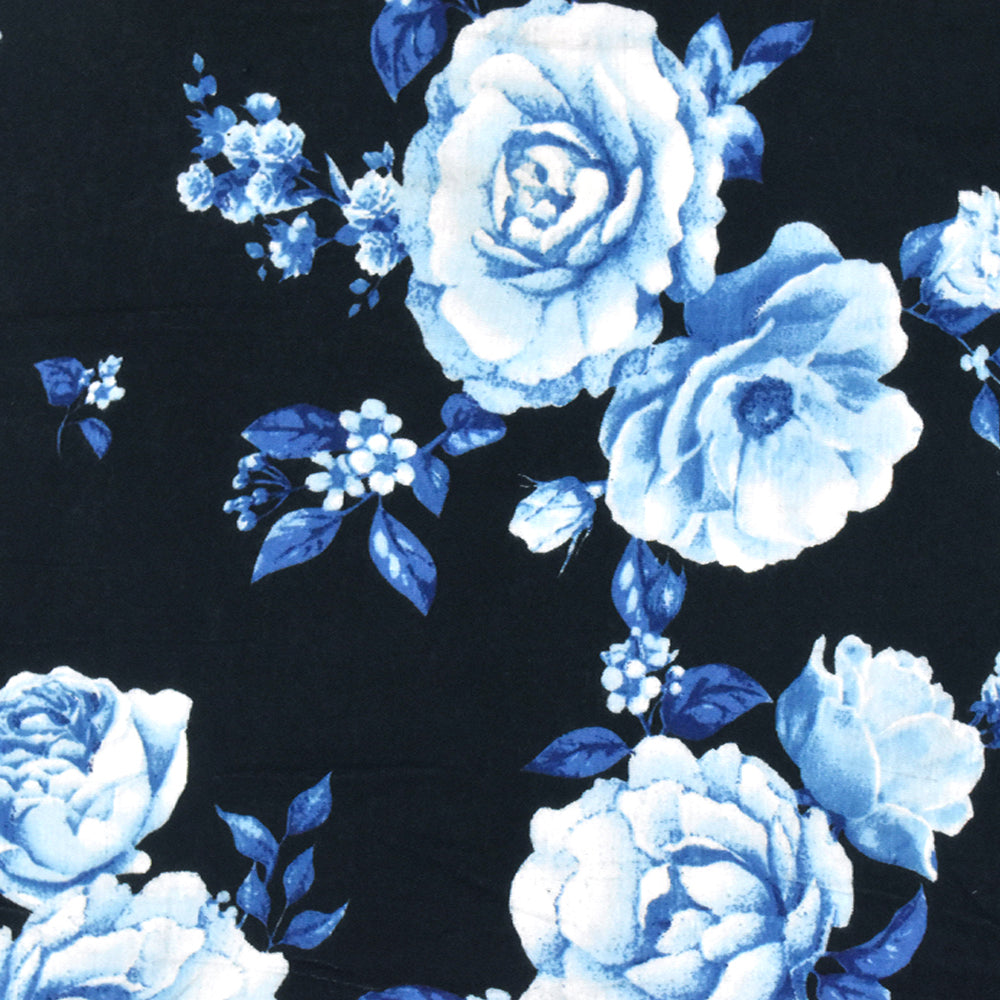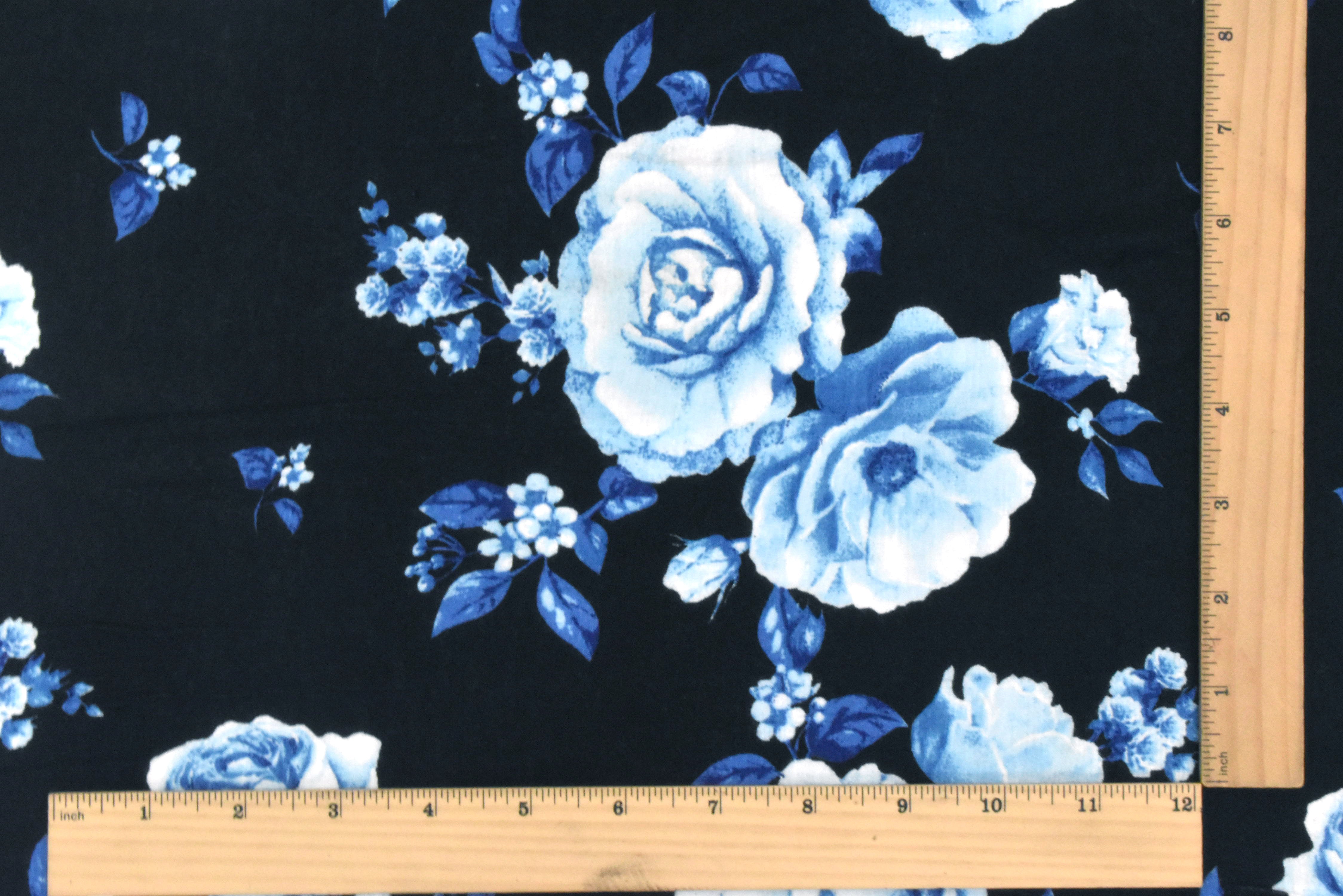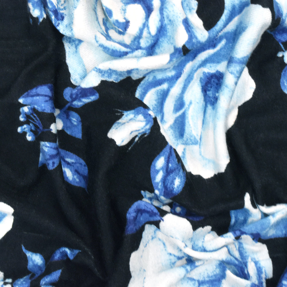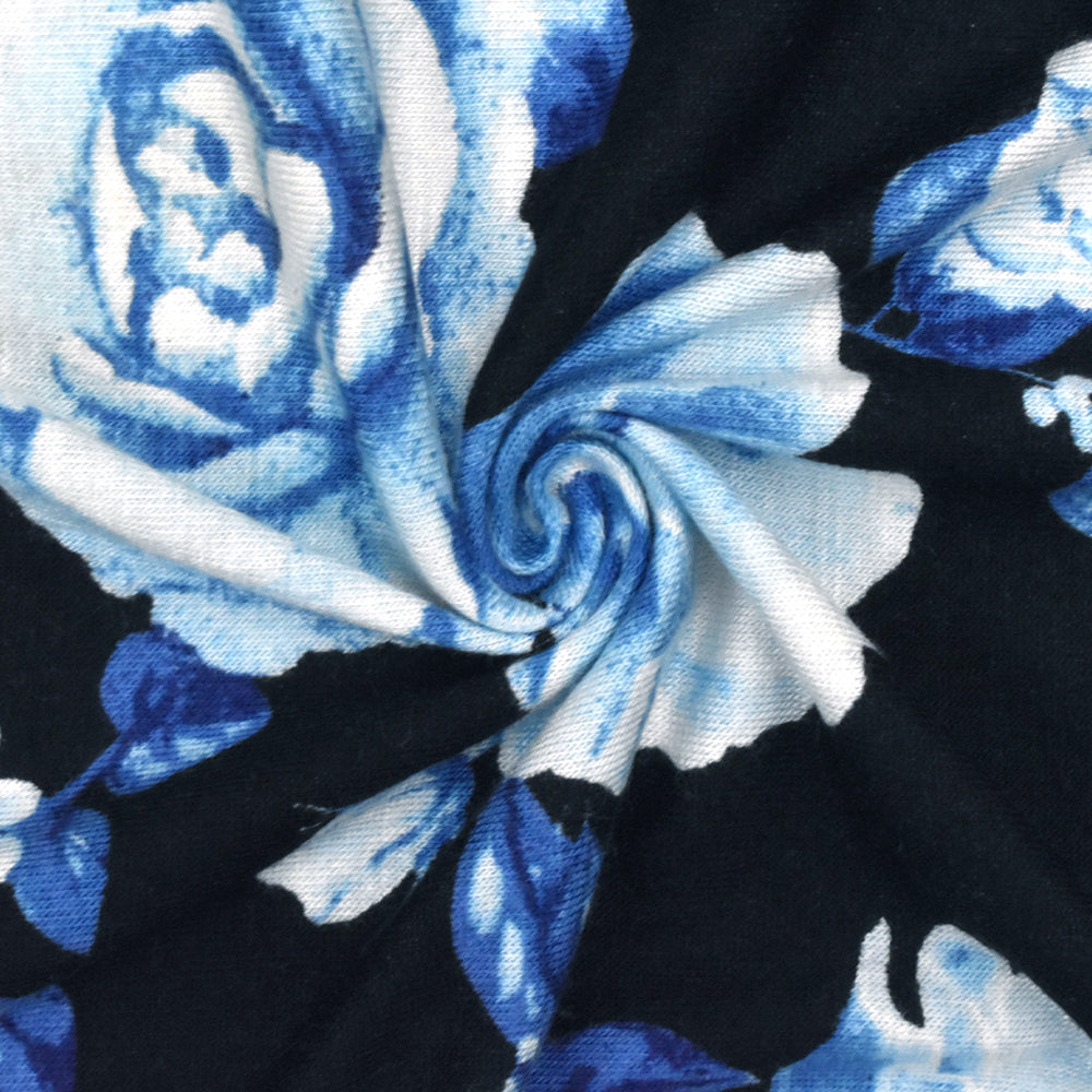 Bell Blue-Black-Multi Floral Printed Rayon Stretch Jersey Knit Fabric