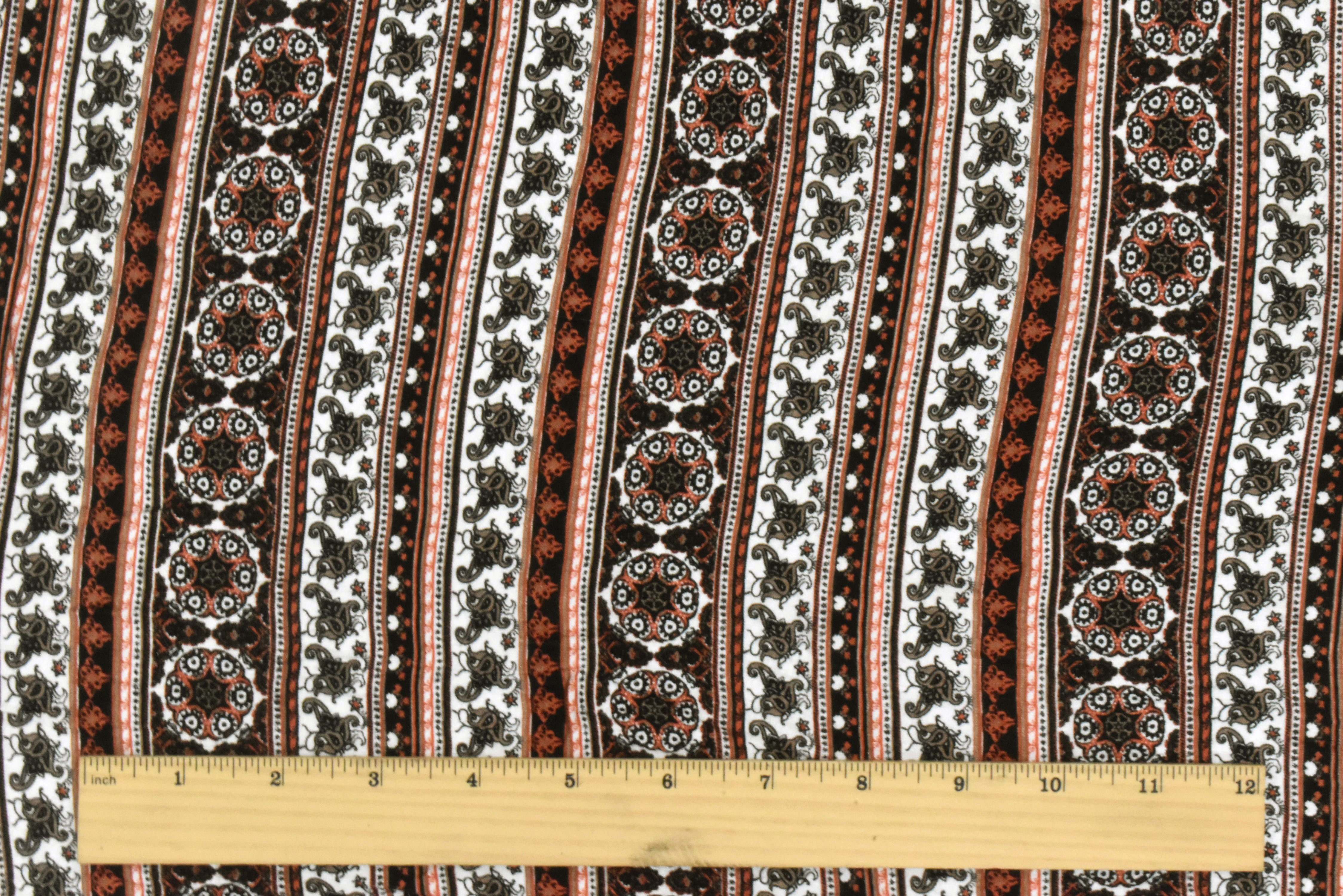 -Low luster morrocan inspired pattern in a striped arrangement printed on a stretch jersey knit fabric