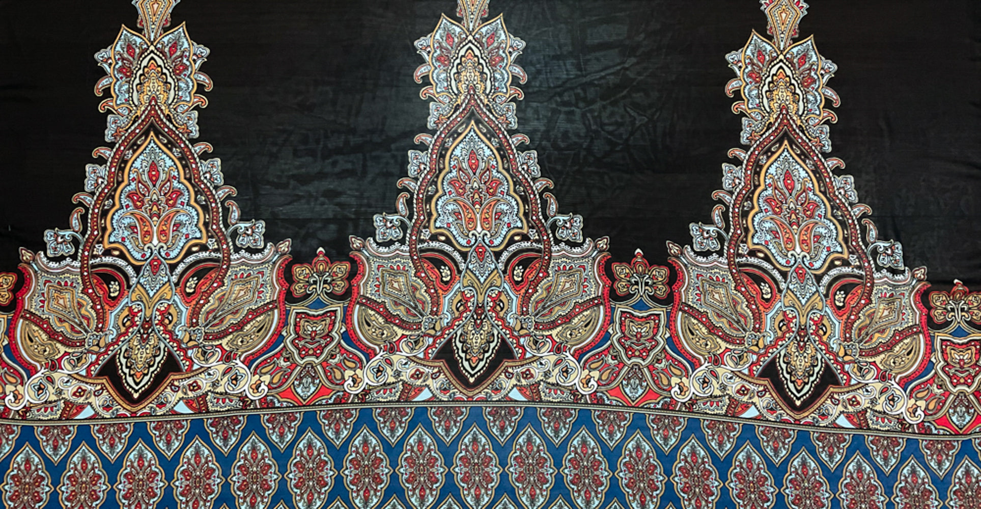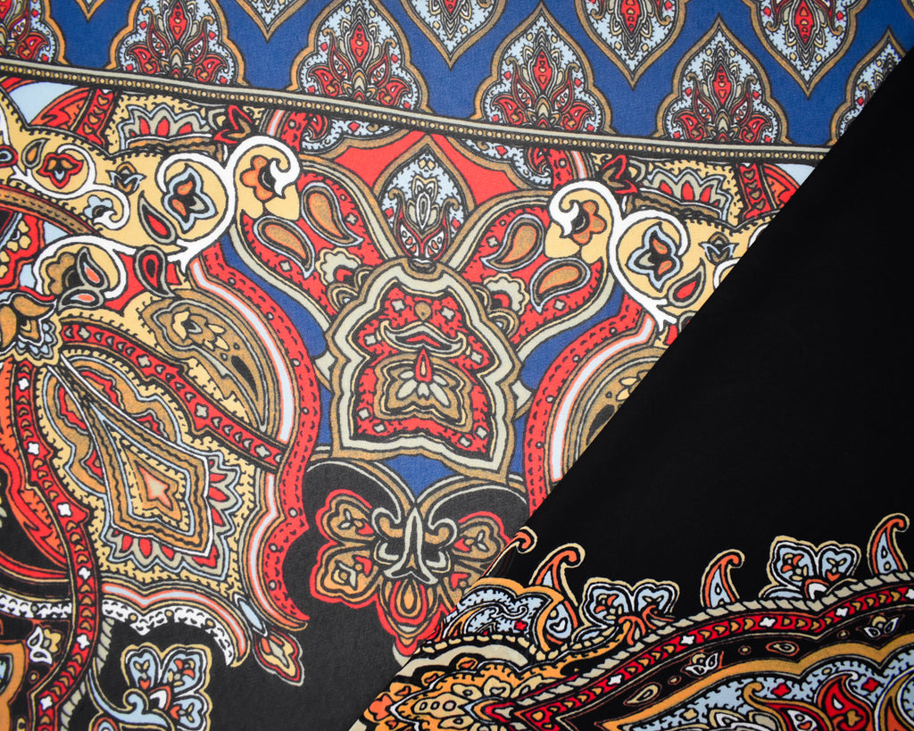 -Black-Orange-Multi Poly Paisely Baroque Border Printed Chiffon Woven Fabric