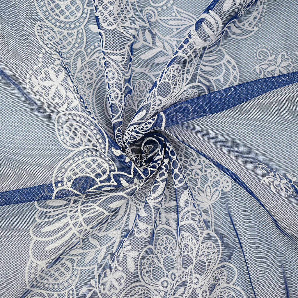 Blue-White Nylon Floral Border Printed Mesh Tulle Knit Fabric