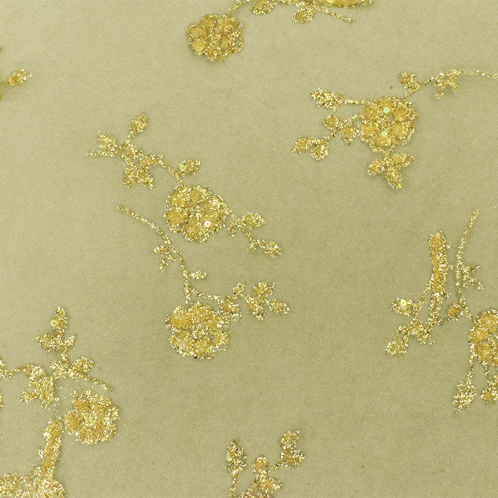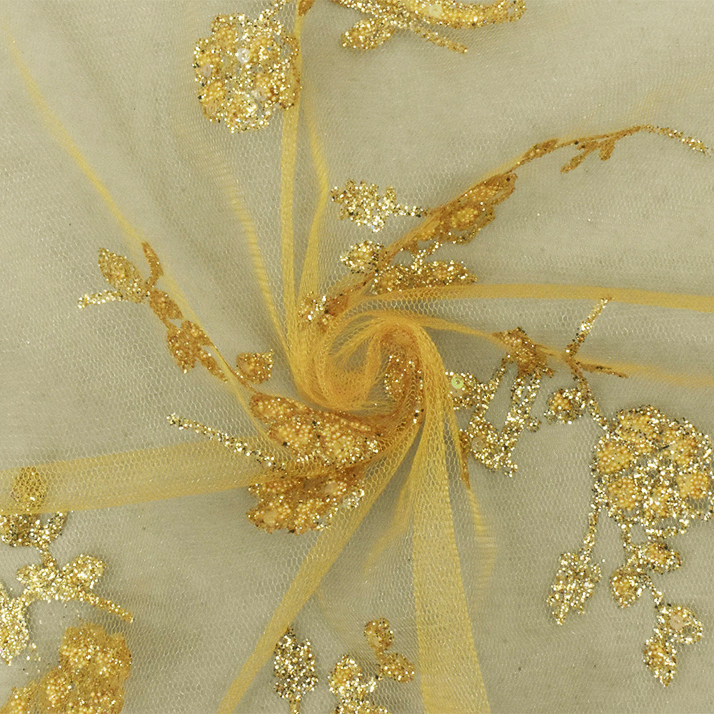 Golden Yellow Floral Sparkles and Bead Poly Mesh Knit Fabric