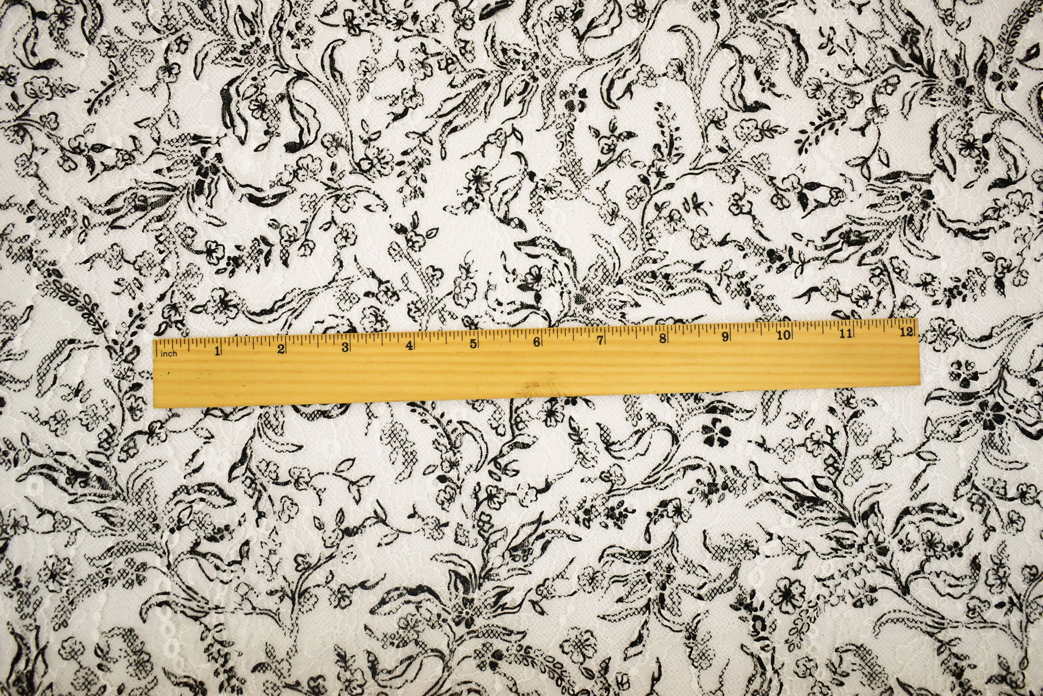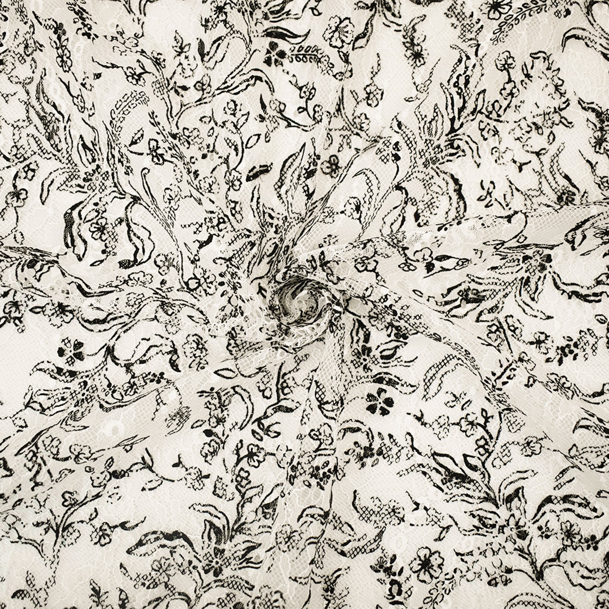 White-Black Nylon Floral Vine Printed Lace Mesh Knit Fabric