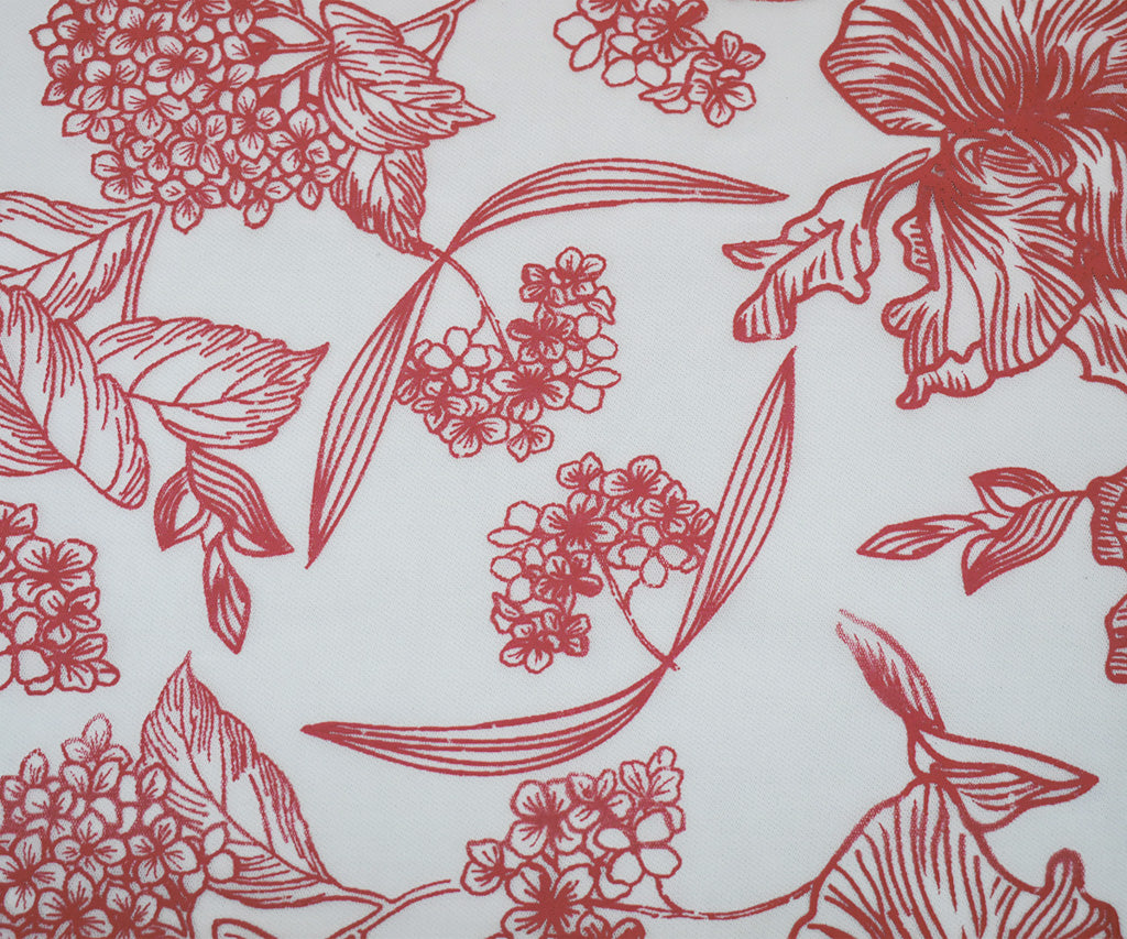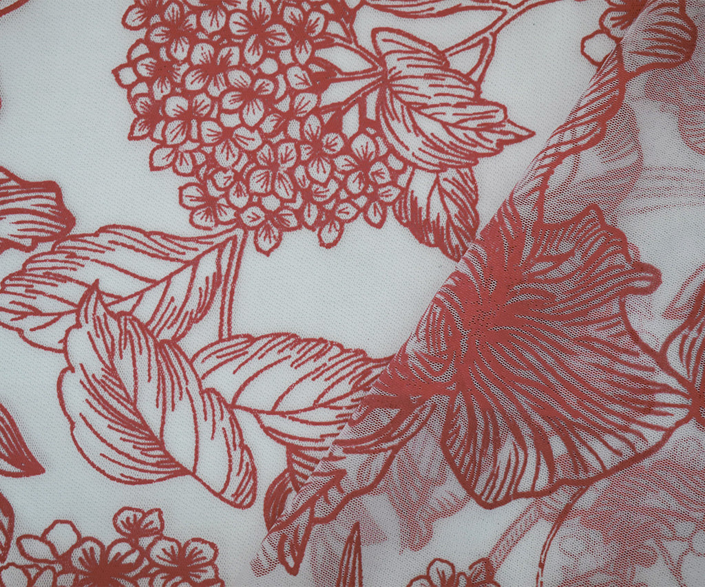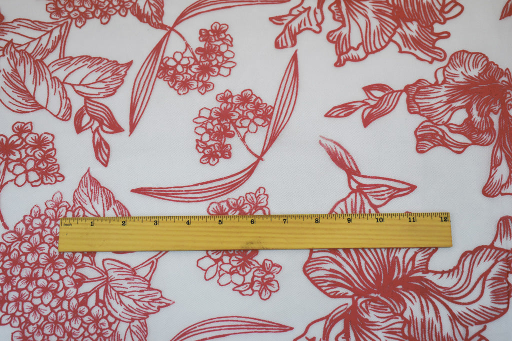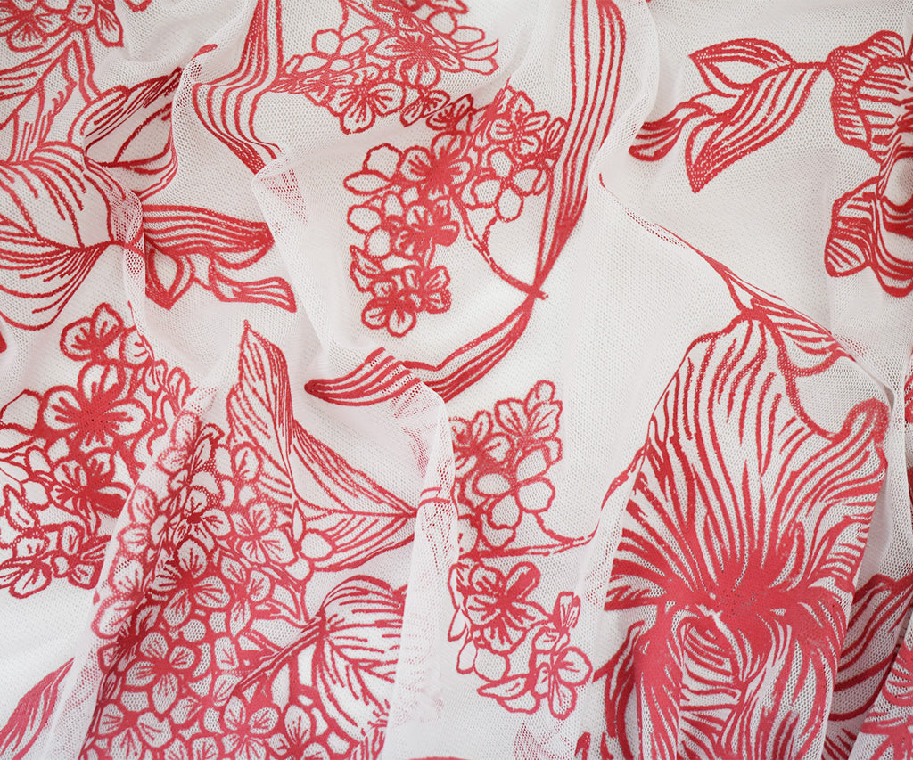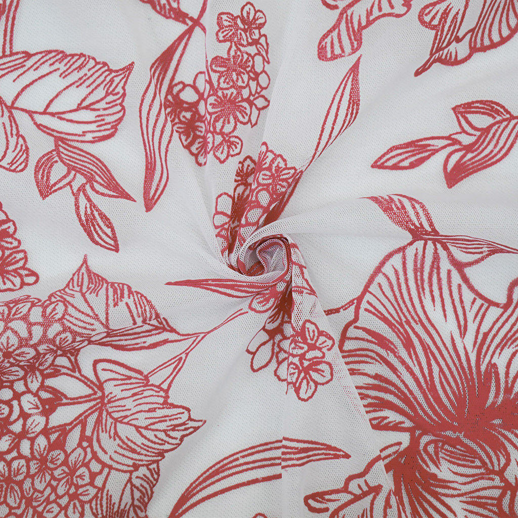 White-Red Nylon Floral Printed Tulle Mesh Knit Fabric