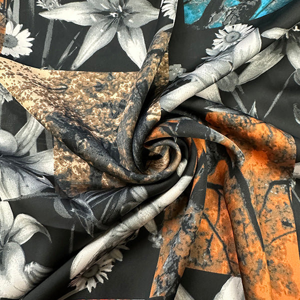 -Black, White, Orange, Tan, Turquoise, Pink, Gray, & Beige Multi Floral Camo Print Poly Charmeuse Satin Fabric