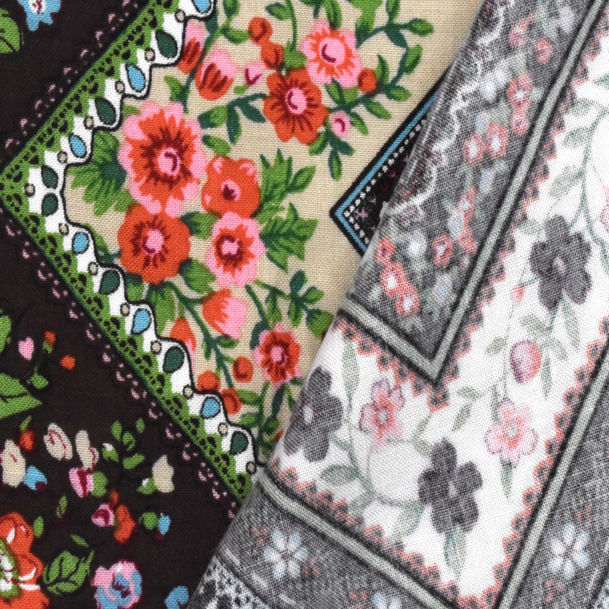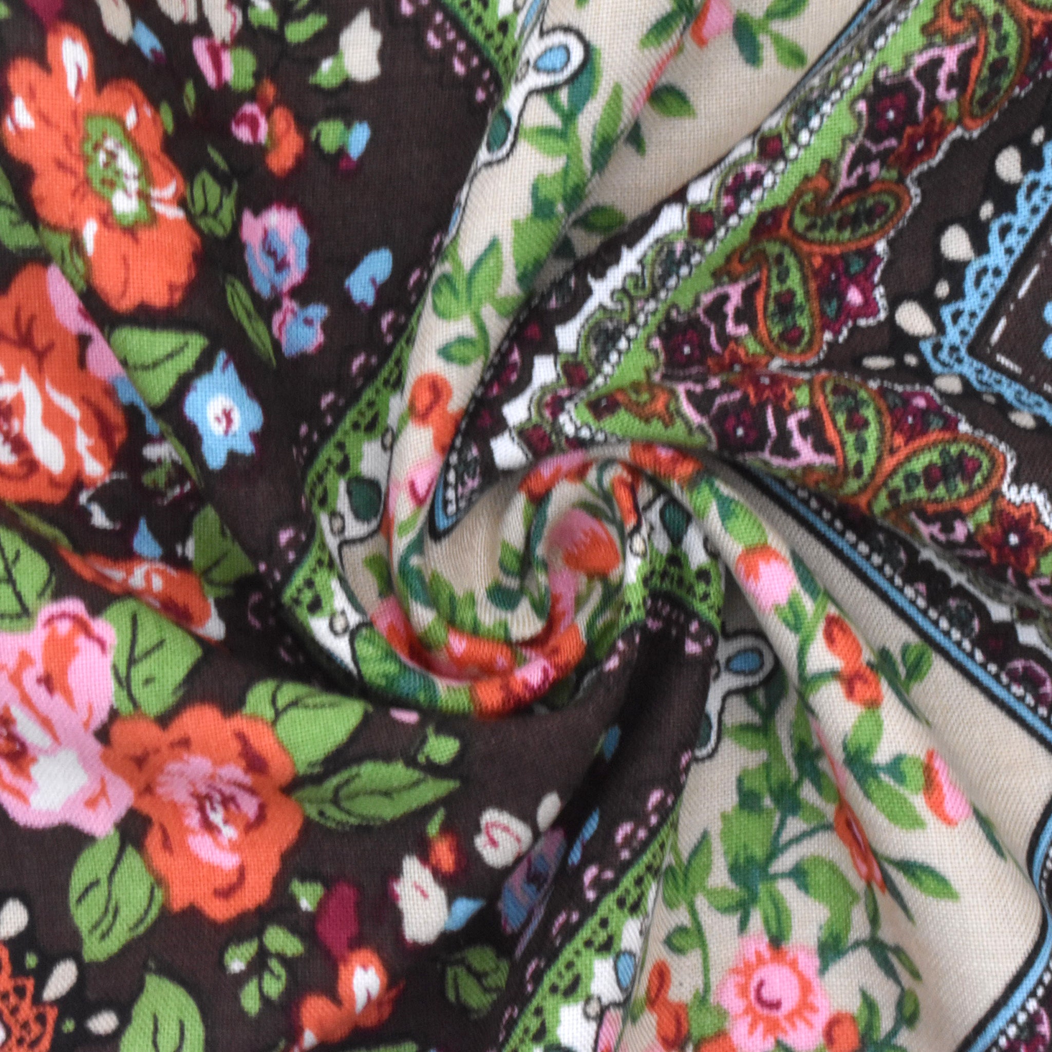 Brown-Green-Multi Chevron Floral Printed Woven Fabric