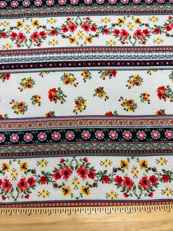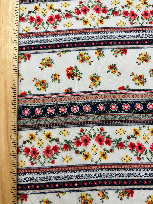 -Ivory, Yellow, Red, Green, Black, & Beige Floral Stripe Print Rayon Challis Fabric