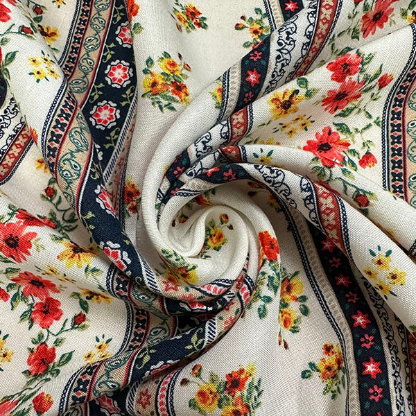 Ivory Floral Stripe Print Rayon Challis Fabric