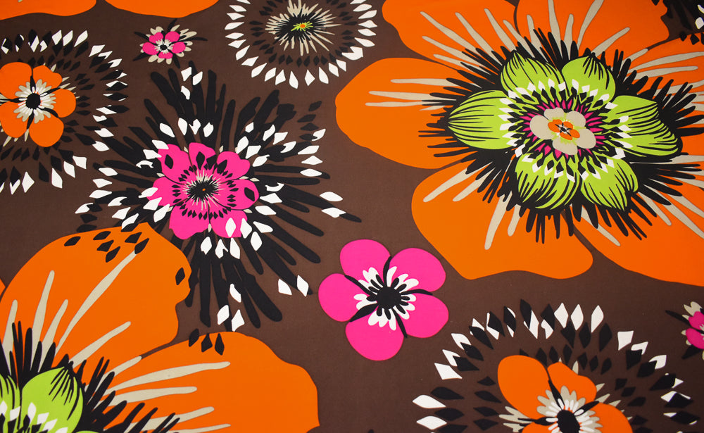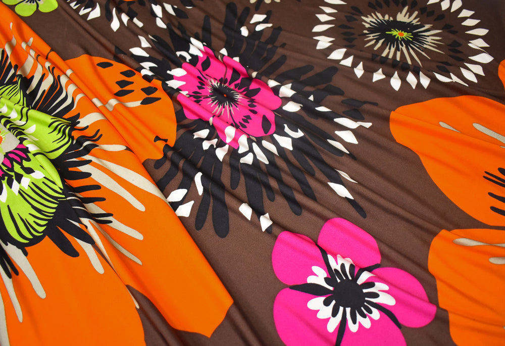 Brown-Lime-Orange-Multi Floral Printed Stretch Silk Jersey Knit Fabric