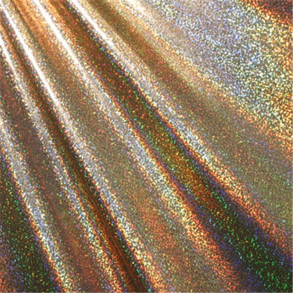 Metallic Gold Hologram Mini Dot Print on Black Spandex Fabric 4 Way Stretch Suitable for Dancewear, Apparel, & Costumes 80% Nylon 20% Spandex 58" Wide