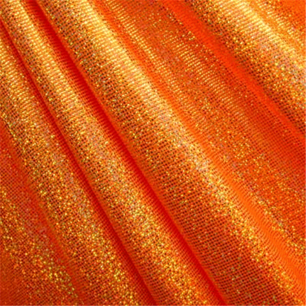 Metallic Gold Hologram Dot Print on Neon Orange Spandex Fabric 4 Way Stretch Suitable for Dancewear, Apparel, & Costumes 80% Nylon 20% Spandex 58" Wide