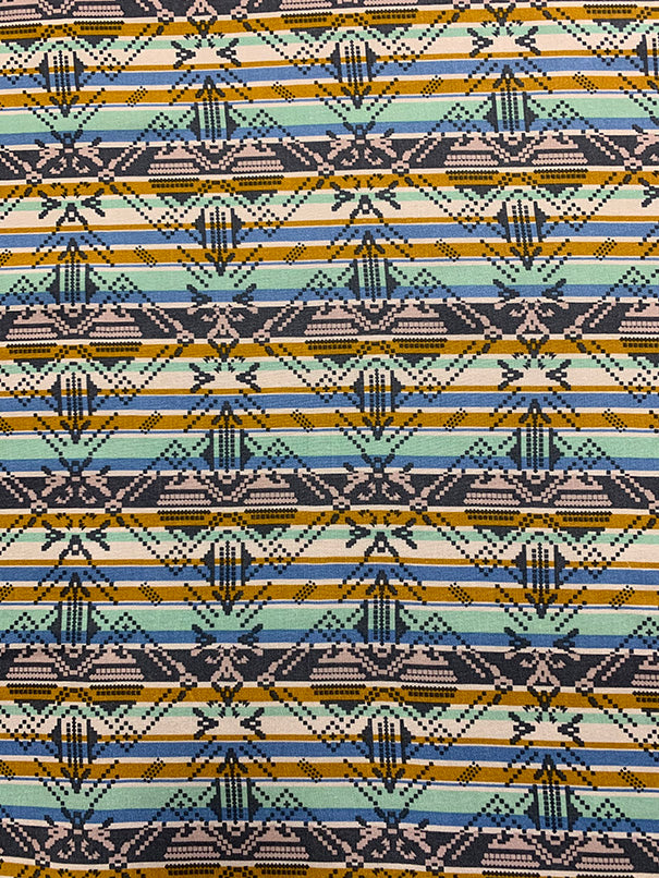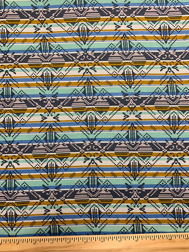 6 1/2 YD PC -Blue, Gold, Seafoam Green, Gray, Light Mauve, & White Multi Horizontal Stripe Print Rayon Challis Fabric