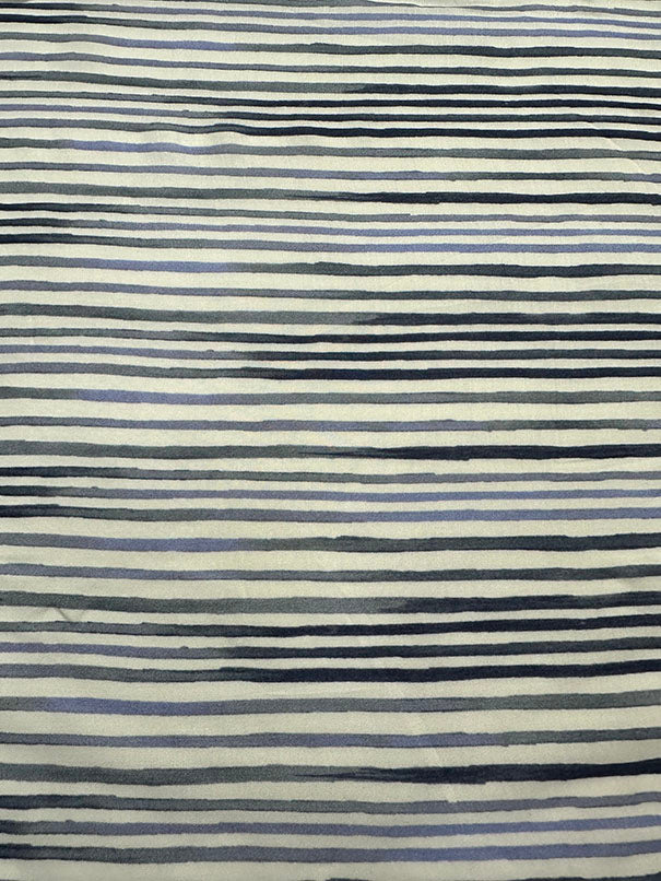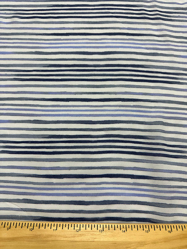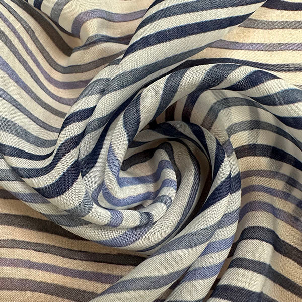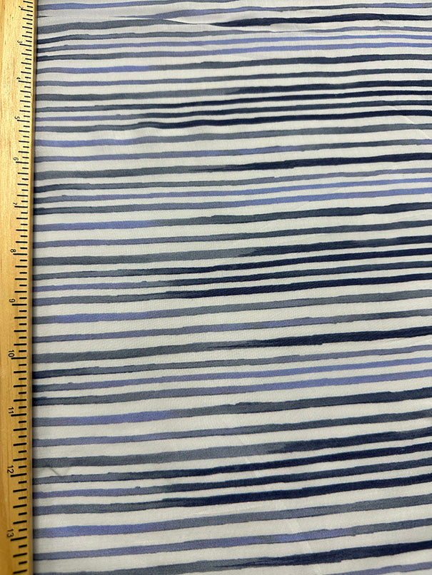 -Shades of Blue Uneven Horizontal Stripes Printed on White Rayon Lawn Fabric