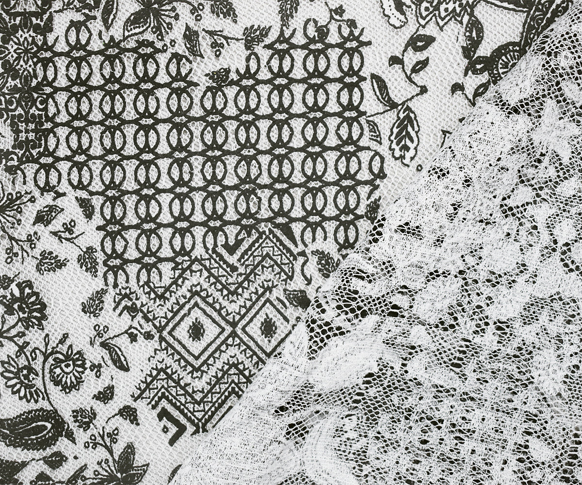 Black-White Poly Floral Patch Printed Lace Mesh Knit Fabric