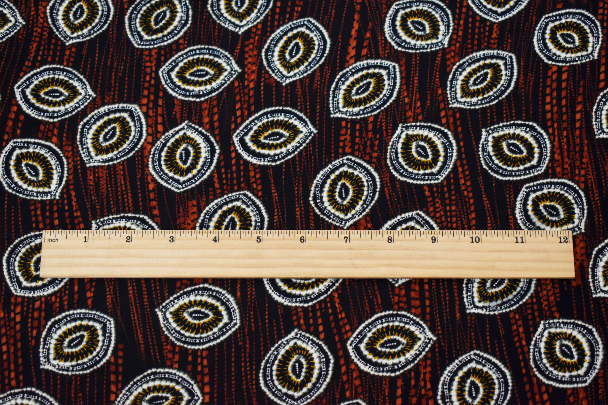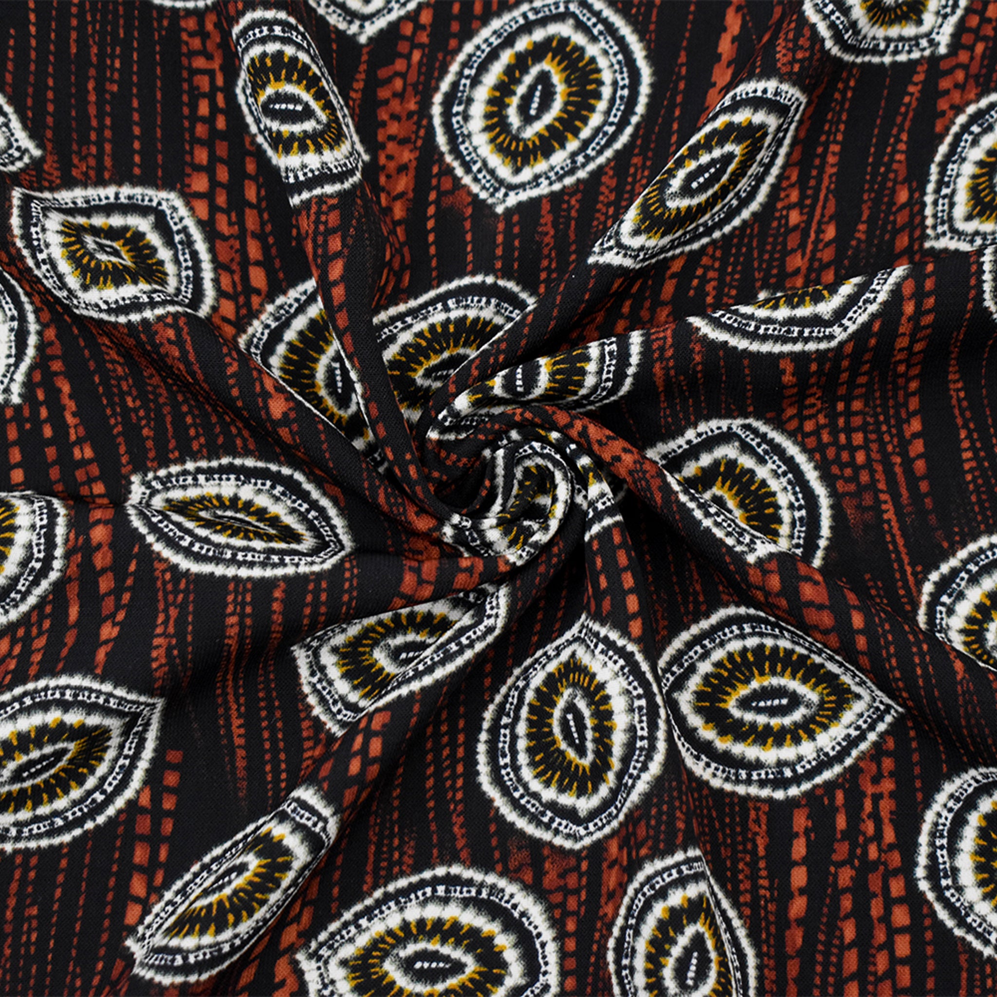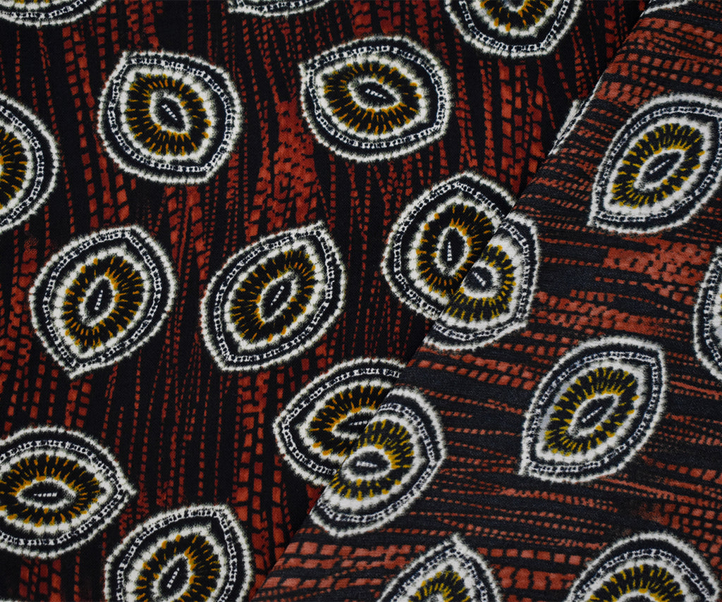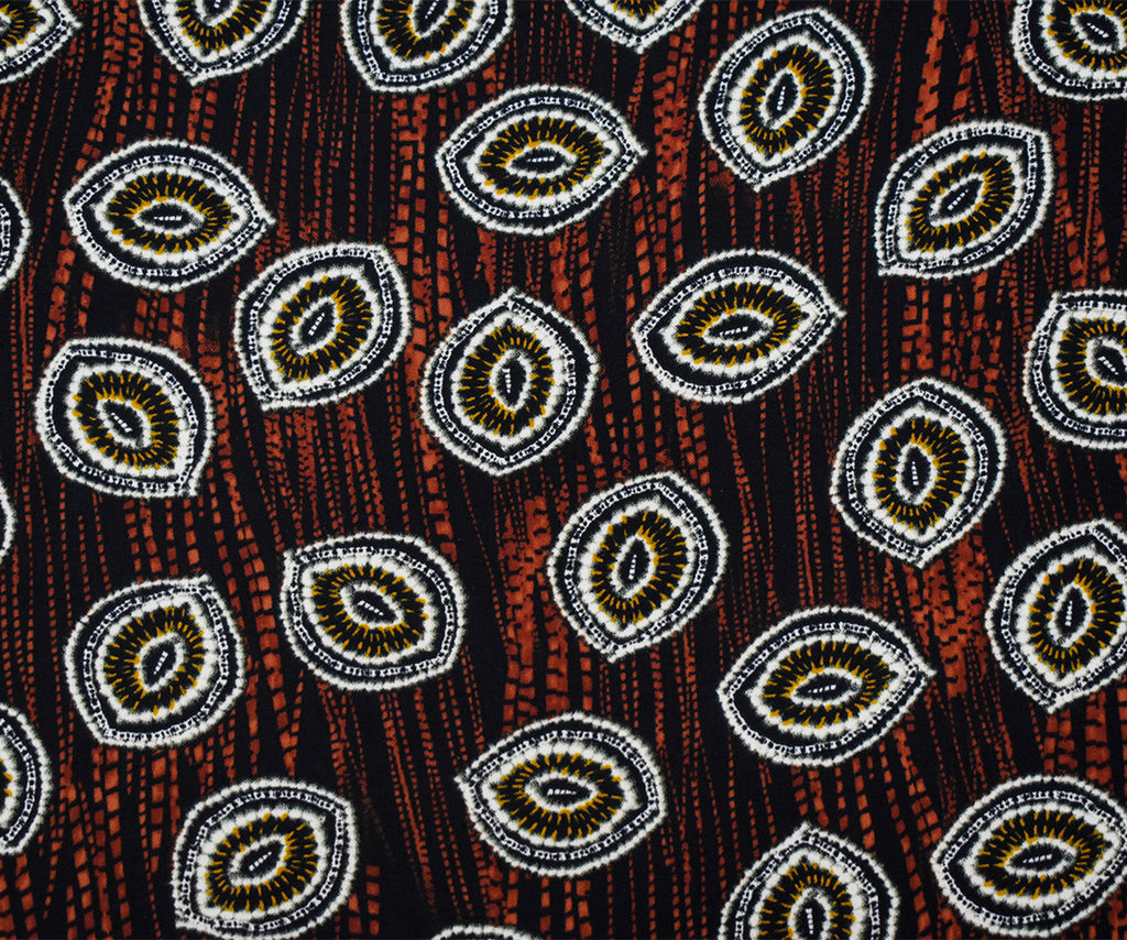-100% Polyester challis woven fabric printed with an abstract tie dye inspired pattern with eye-like motifs and abstract stripes